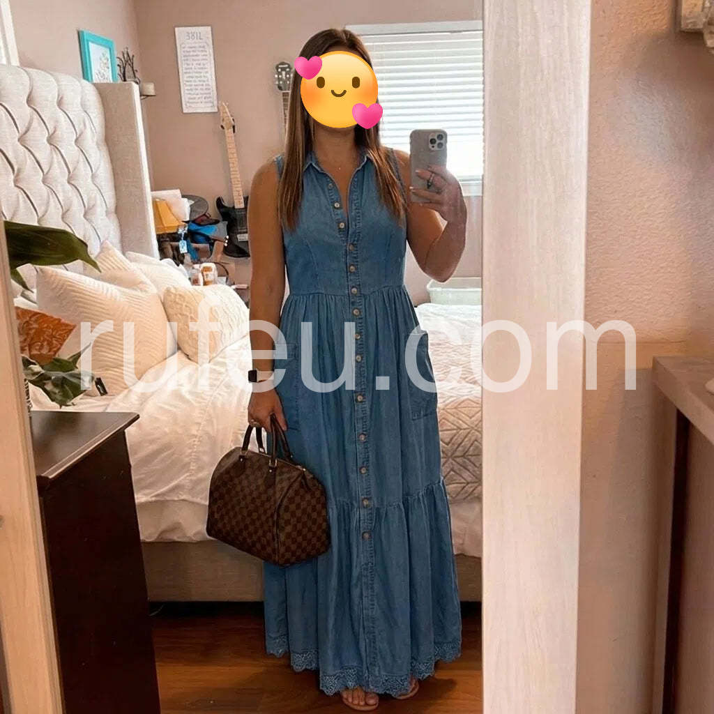 Blue Sleeveless V-Neck Button Front Denim Maxi Dress