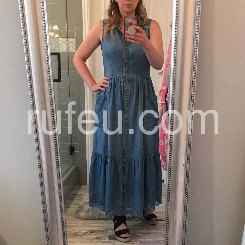 Crafted from premium denim, this sleeveless maxi dress combines timeless style with modern versatility. The flattering V-neckline and button-front closure create a refined silhouette that transitions effortlessly from casual daytime wear to evening occasions. The full-length cut offers elegant coverage while the structured denim fabric ensures durability and shape retention. Perfect for layering with jackets or cardigans, this wardrobe essential delivers both comfort and sophisticated appeal.