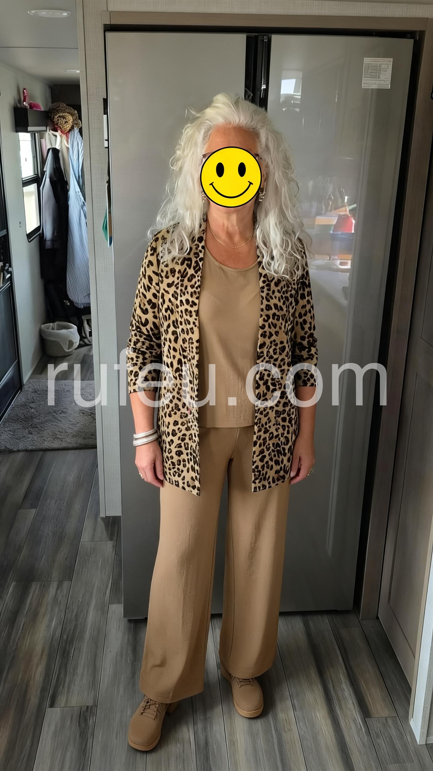 This two-piece set is an absolute staple now. The neutral tone matches everything, and the pop of animal print gives it great personality. Washes beautifully on the delicate cycle. I let it air dry and it looks brand new.