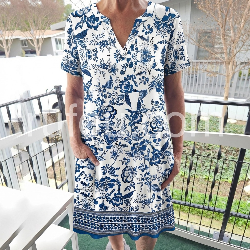 The V-neck, flowy shift silhouette, and deep pockets create a flattering, practical fit. The border hem adds a refined, artisanal touch, ideal for casual outings and garden days.