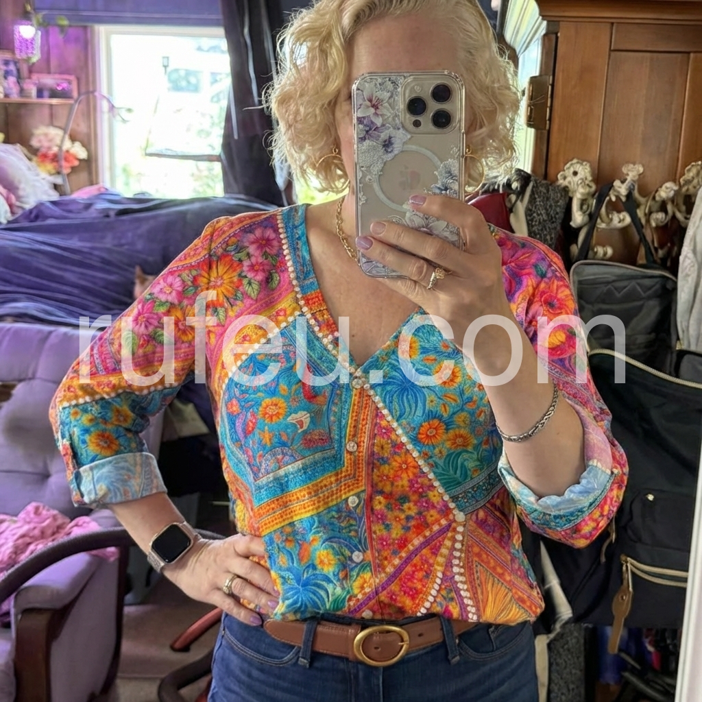 This boho-inspired top features a bold, multi-colored floral and geometric print with rich blues, pinks, yellows, and oranges. The V-neck design and front button closure add a classic touch to the vibrant pattern. Three-quarter sleeves with rolled cuffs offer a relaxed fit. Perfect for casual outings, beach days, or festival wear. Lightweight fabric ensures comfort and effortless style.