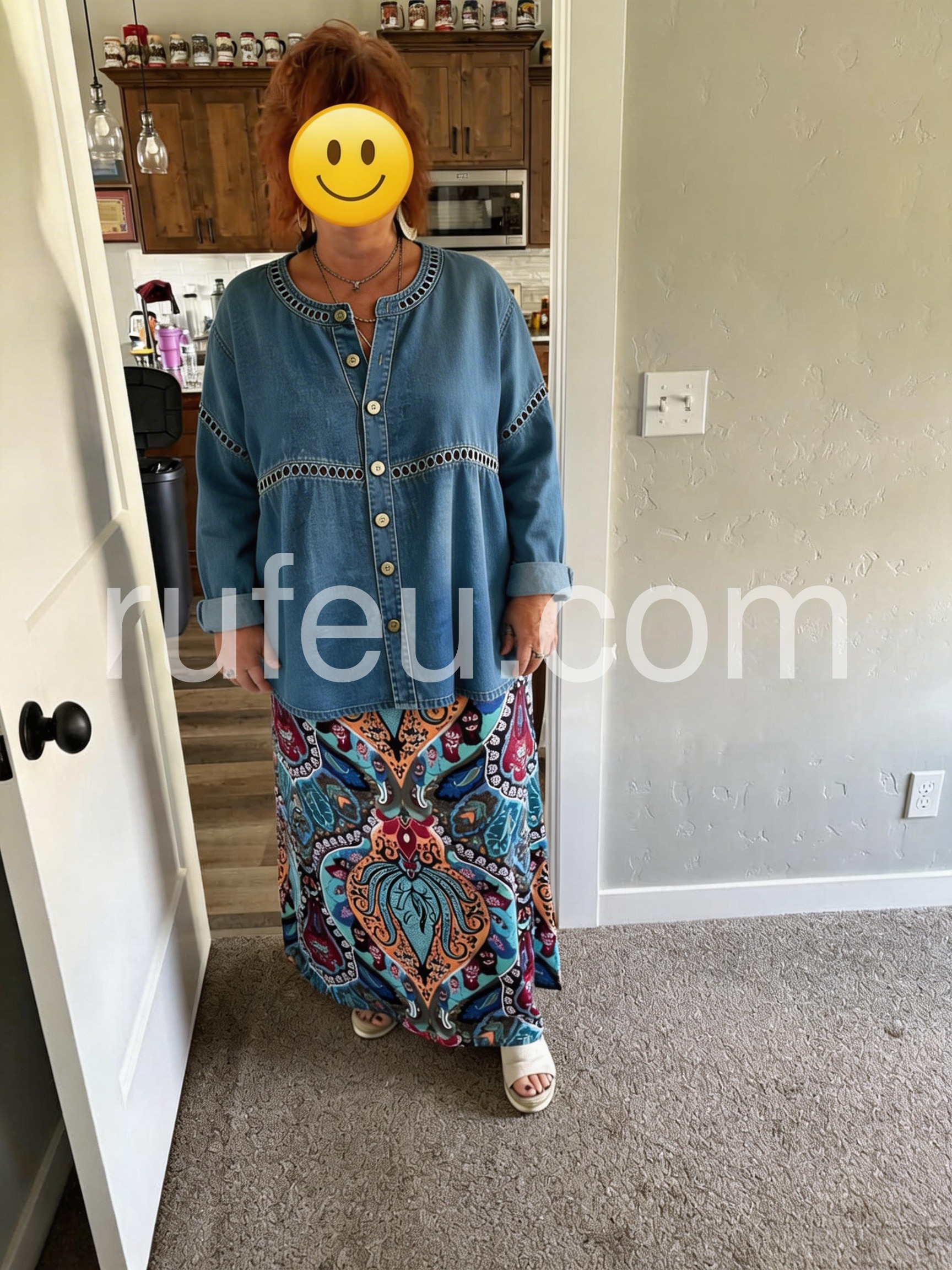 Embrace laid-back elegance in this Blue Denim Button Down Top with Embroidered Trim, a stylish and comfortable piece that blends classic denim appeal with artisanal details. Crafted from soft, medium-wash denim fabric, this tunic features a relaxed, oversized silhouette with a flattering round neckline and front button closure, offering both ease and timeless charm. The standout design element is the decorative embroidered trim—featuring a delicate dotted pattern—accenting the neckline and waistline, adding a touch of boho flair and texture. Styled here with layered necklaces, bracelets, and distressed denim bottoms, it’s ideal for weekend errands, coffee dates, or a leisurely walk through the city.