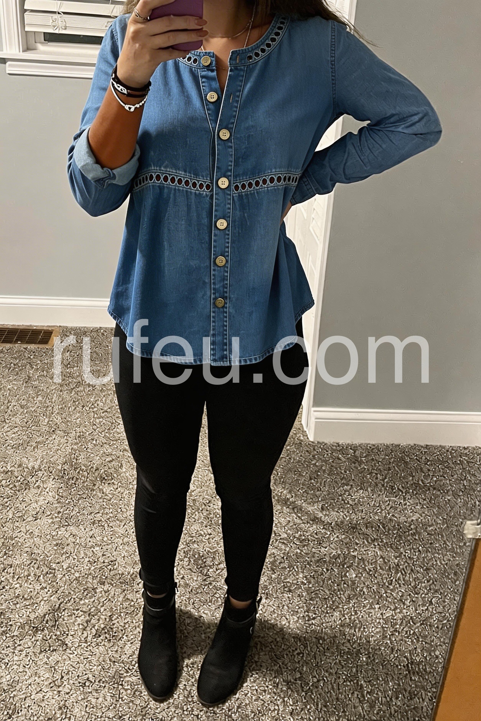 The little cutout embroidery around the waist and neckline makes this stand out from a basic denim shirt. It washes well and did not shrink. Very happy with this purchase.