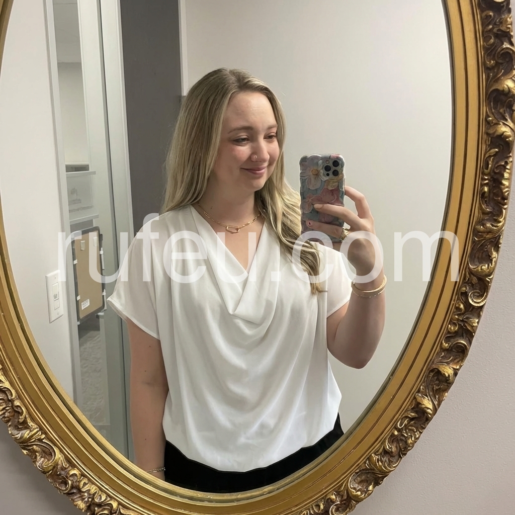 Absolutely love this top! The draped cowl neck is so flattering and elegant. The material is lightweight and flowy, perfect for summer or layering under a cardigan. It looks fantastic paired with my favorite jeans.