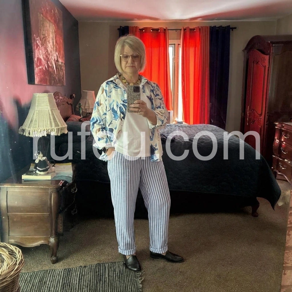 I was worried the baggy style might make me look bulky, but the tailoring is surprisingly flattering. The vertical stripes definitely help! They are super breezy for the hot southern summers. Will be buying in other colors if available.