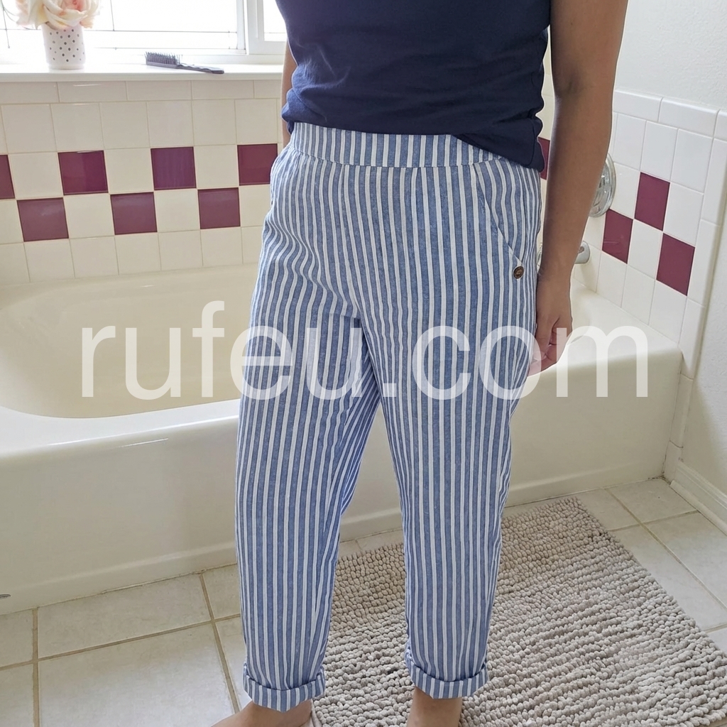 I am absolutely thrilled with these striped trousers. They are comfortable enough for all-day wear and look very chic. The rolled hem gives them a modern touch. They fit perfectly around my waist and leave plenty of room in the legs.