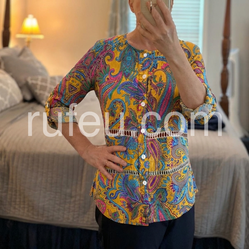 This long-sleeve tunic features a rich yellow base with colorful paisley patterns. The front button design adds vintage charm. Relaxed fit and rolled sleeves for comfort. Perfect for casual wear or bohemian styles. Pair with jeans or leggings for effortless flair.