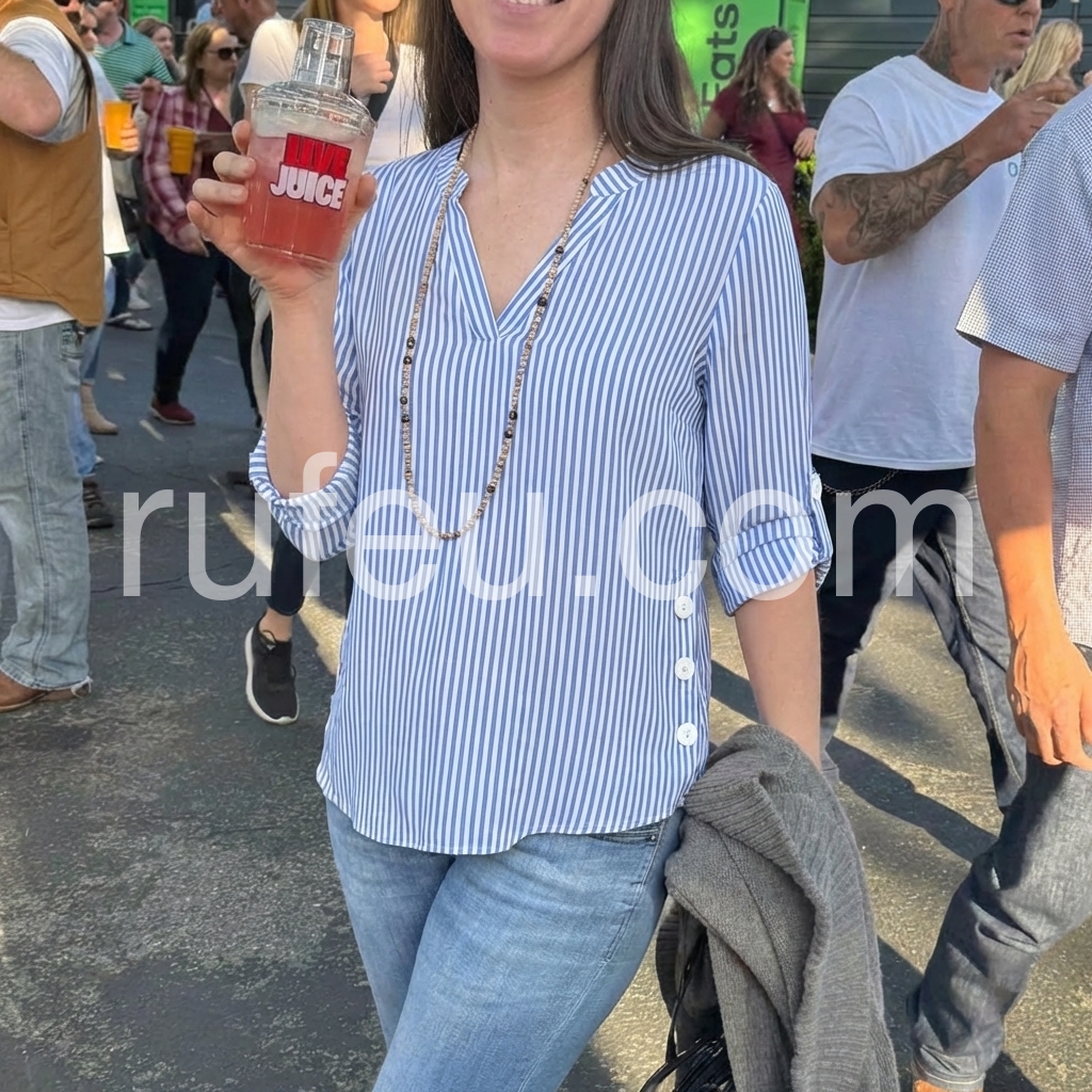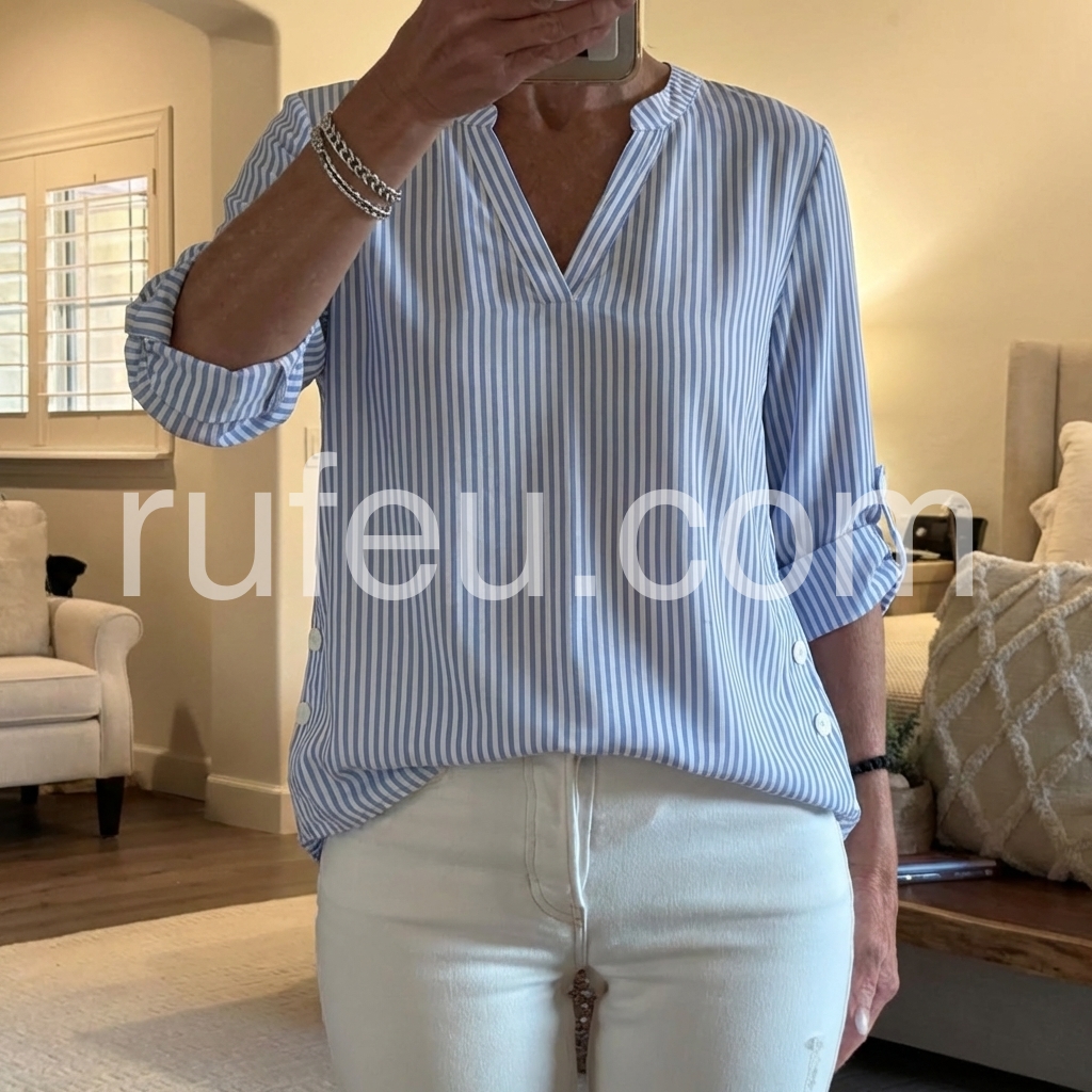 This elegant top features vertical blue and white stripes with a soft V-neckline. Side buttons add a stylish detail. Three-quarter sleeves with rolled cuffs for comfort. Lightweight fabric perfect for casual or office wear. Effortlessly chic and breathable.
