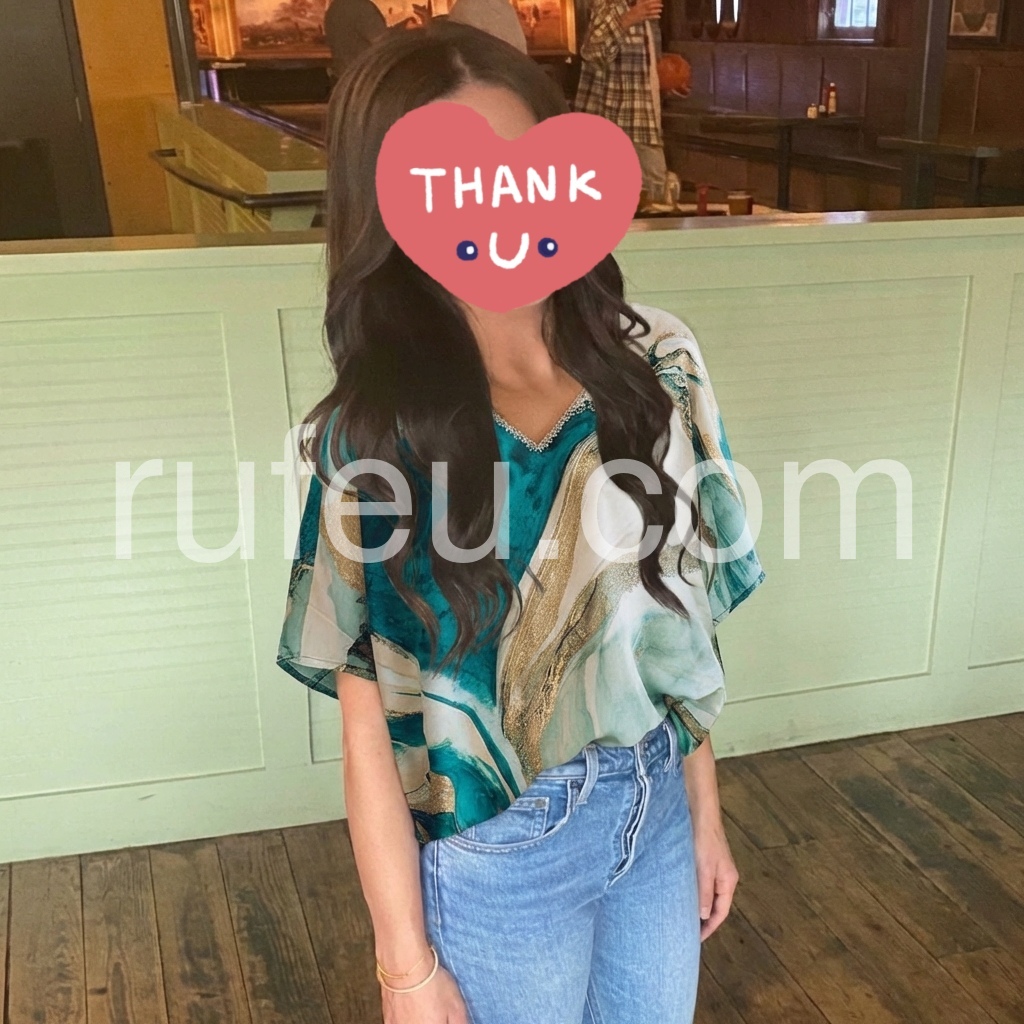 This loose-fitting top features a bold emerald, gold, and cream abstract design. V-neckline with delicate trim for added detail. Wide sleeves and relaxed silhouette for effortless comfort. Perfect for warm days or beachwear. Stylish and easy to pair with pants or shorts.