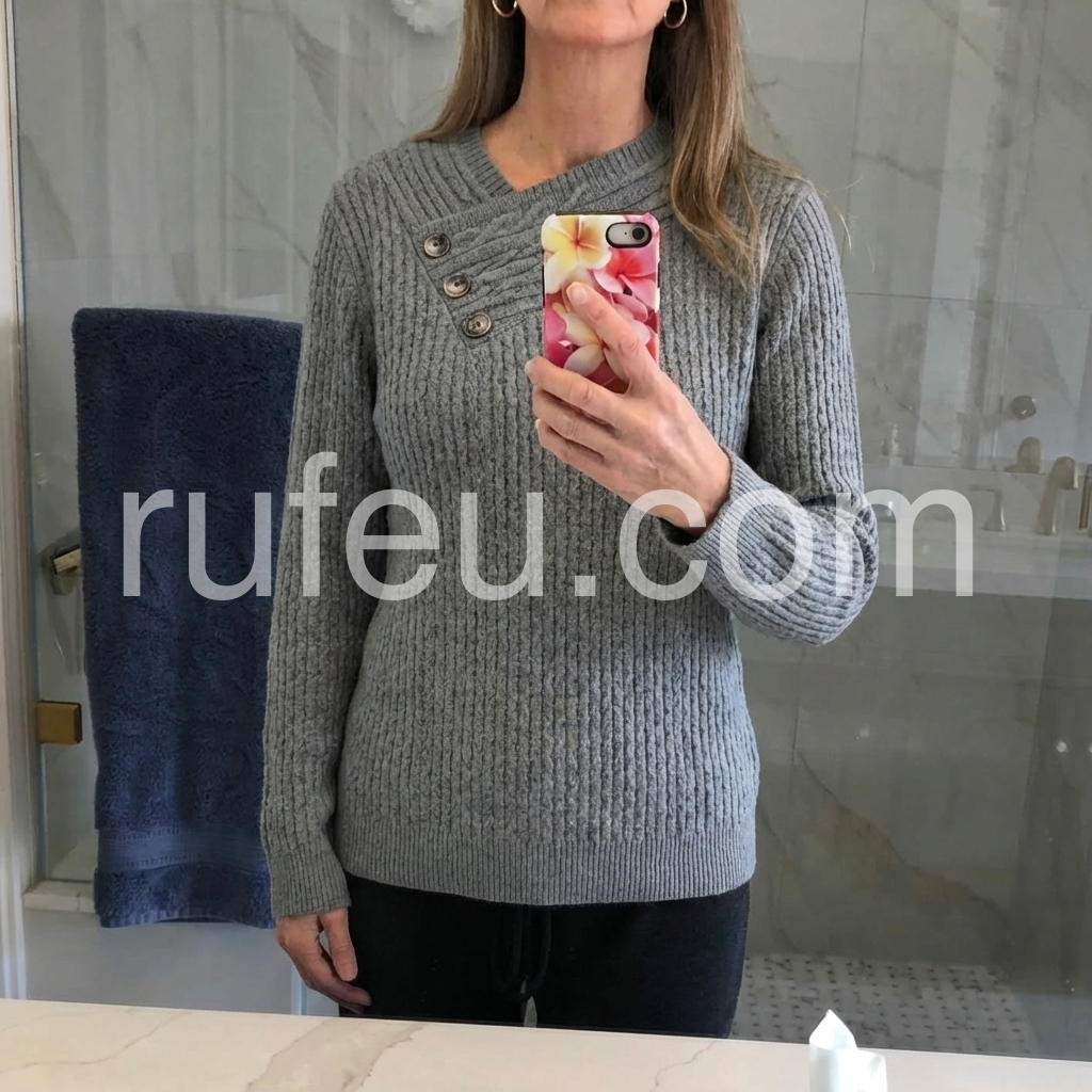 I’m obsessed with this stylish gray sweater! The intricate knit pattern gives it a luxurious look, and the button detail on the neckline is such a cute accent. The fabric is thick enough to keep me warm but not bulky, making it ideal for layering. The fit is relaxed and flattering, draping beautifully over my frame. It’s quickly become my go-to for weekend outings and office casual days—so easy to dress up or down!