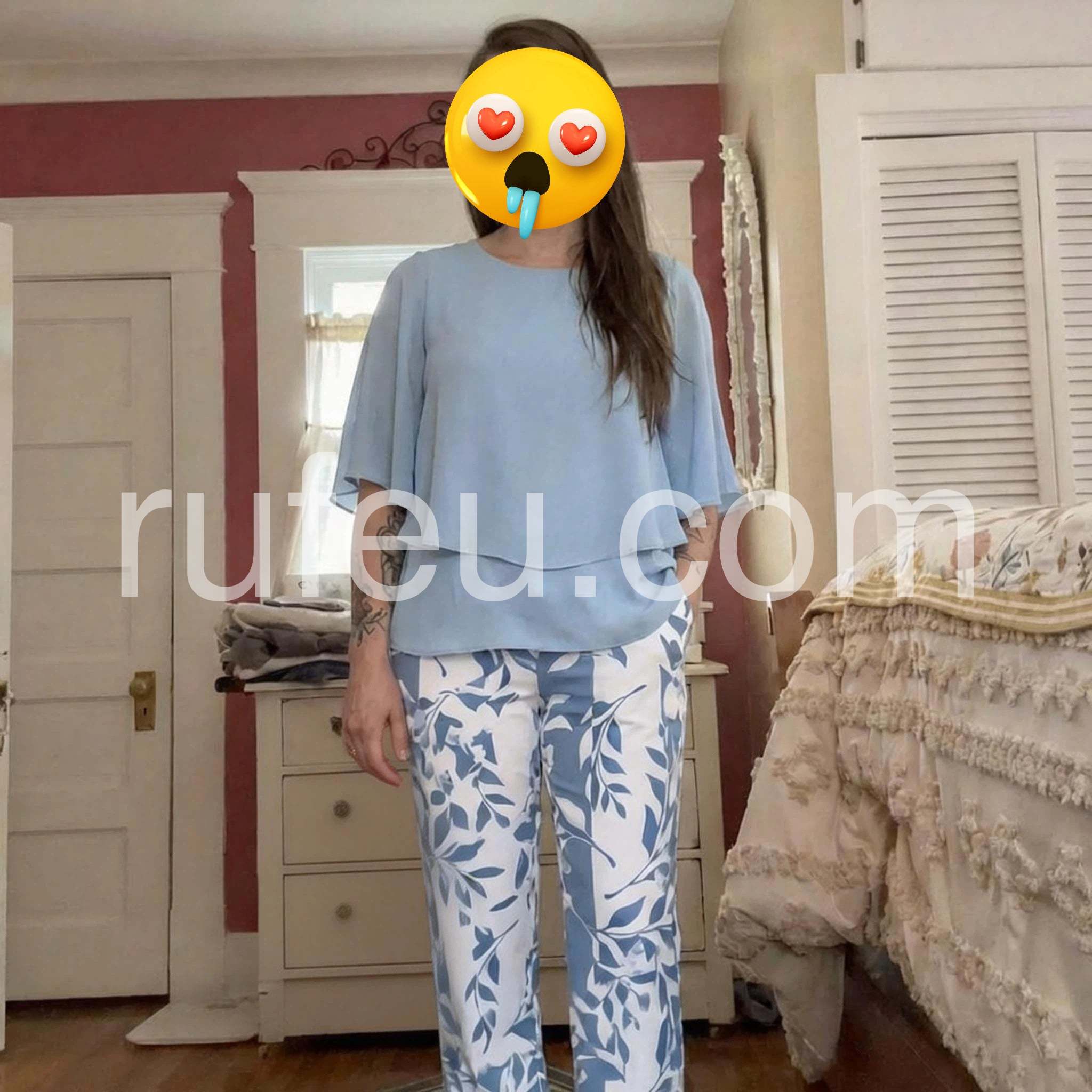 I wore this two-piece set on a recent cruise and received so many compliments! The light blue color is stunning, and the layered top perfectly hides any tummy insecurities. The pants are incredibly comfortable and flowy. Highly recommend for any summer vacation.