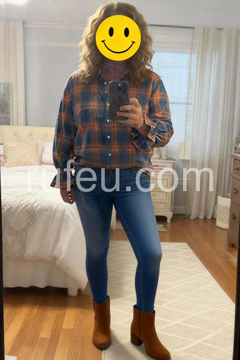 This blue check button-down shirt features elegant ruffle cuff sleeves, blending classic style with a modern twist. Crafted for a refined look, it offers a tailored fit that enhances your silhouette while providing comfort throughout the day. Ideal for professional settings or casual wear, this shirt adds a subtle yet distinctive detail that elevates any outfit.