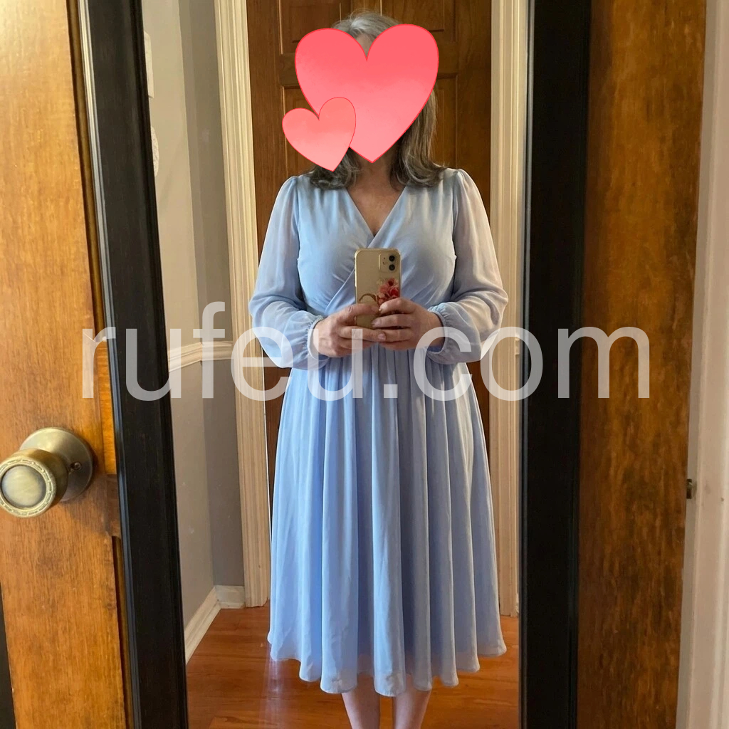 This dress is absolutely beautiful! The light blue color is so pretty and it looks very flattering. I love the V-neck and the long sleeves with a gentle puff—everything feels balanced and elegant. The fabric looks soft and breathable, and the skirt has a nice flow that doesn’t cling. It’s perfect for outdoor days and looks exactly like the photos. Highly recommend!