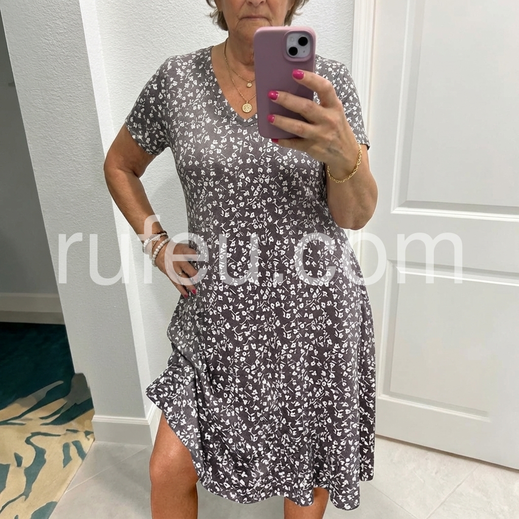 The V-neck and short sleeves keep it light and breezy, while the fitted waist and flowy skirt hug my curves just right. I love how it swishes when I walk!