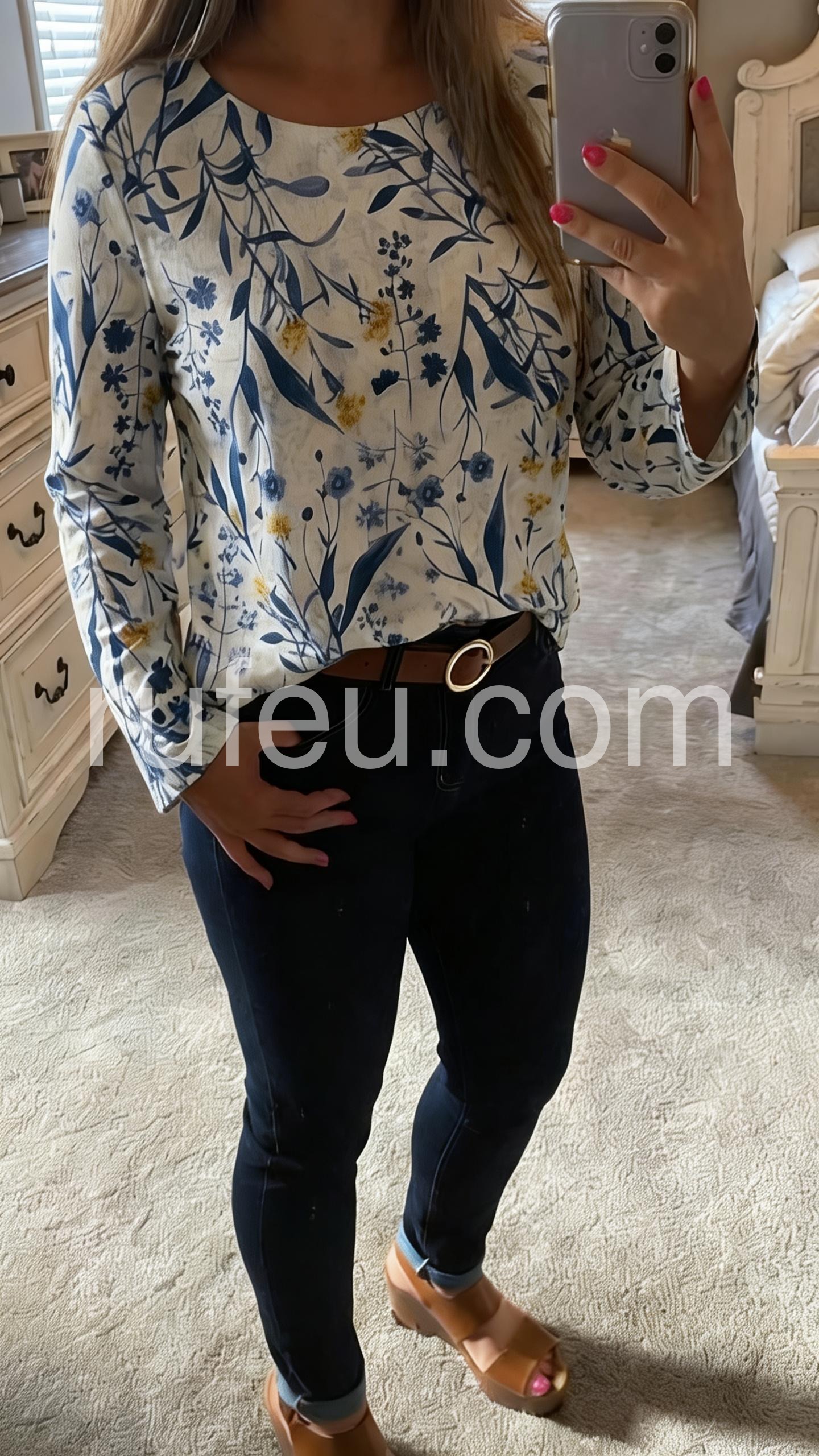 This loose-fit top features a delicate blue and yellow floral print on a soft white base. Long sleeves with a relaxed, batwing silhouette. Round neckline and asymmetrical hem for effortless style. Lightweight fabric perfect for casual days. Ideal for pairing with jeans or leggings.