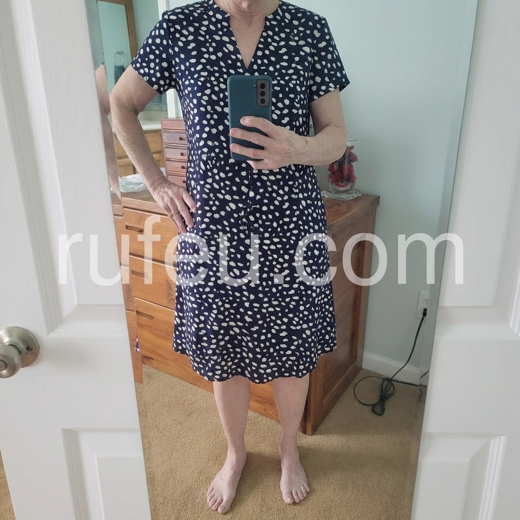 I absolutely love this dress! The fit is incredibly flattering and forgiving, especially around the midsection. The material is lightweight and perfect for summer weather. I wore it to a lovely outdoor brunch and received so many compliments on the fun spotty print. It hits right at the knee for me, which is exactly what I wanted.
