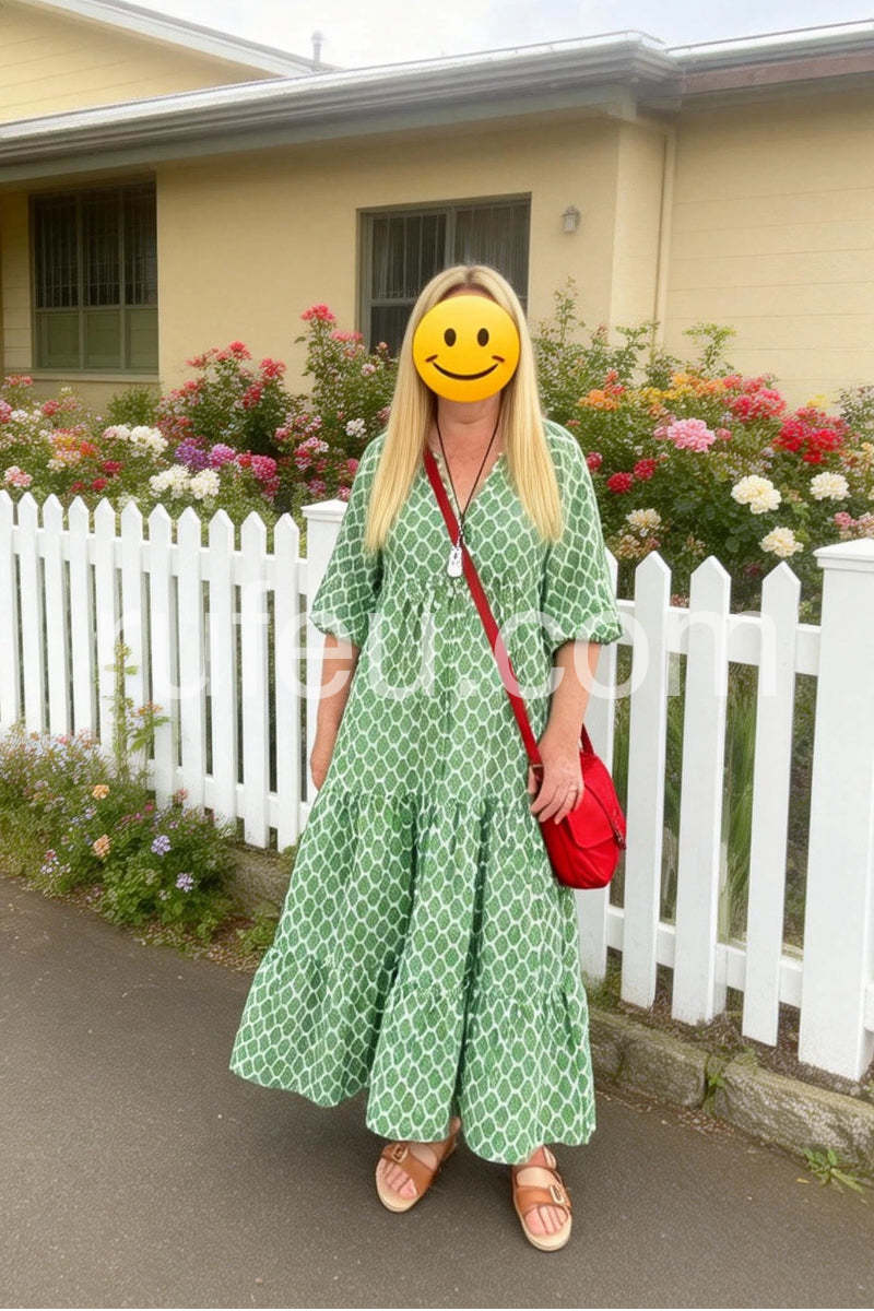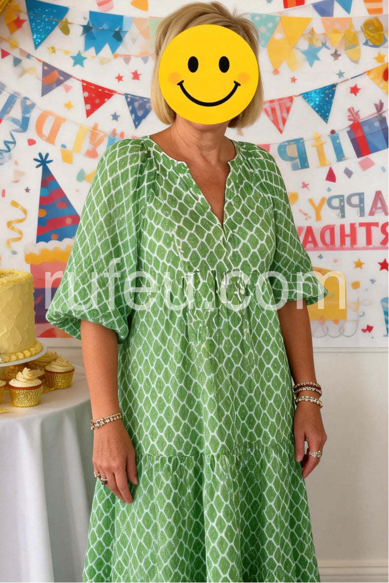 Get ready to turn heads everywhere you go in this above-the-ankle, vibrant green and white honeycomb print maxi dress! This laid-back and elegant dress is perfect for taking a stroll through your local farmer's market, making your way through a museum, or lunch with friends.