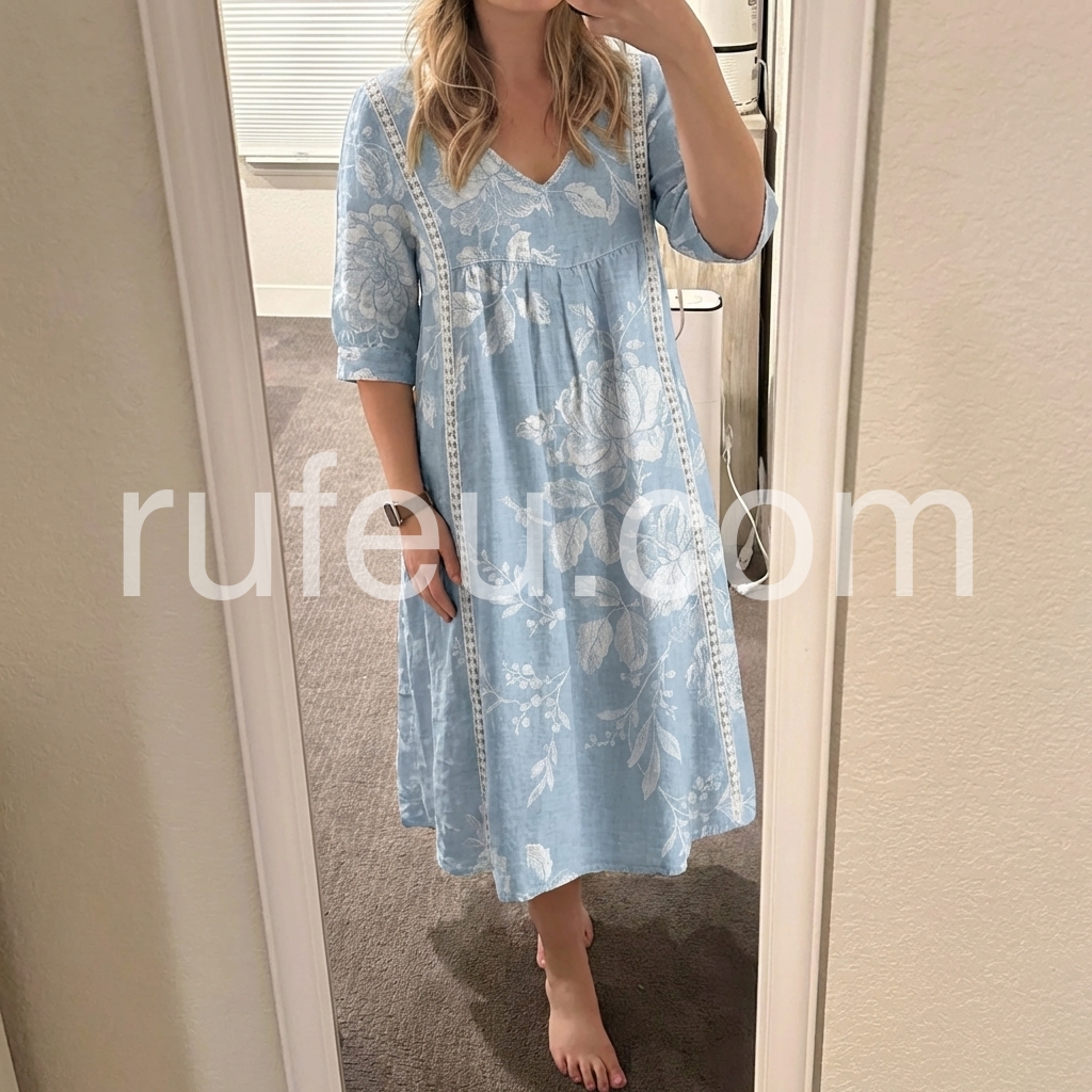 This casual midi dress features a flattering V-neck and loose A-line silhouette, offering all-day comfort and a relaxed fit. Crafted from breathable, linen-like fabric, it’s perfect for warm weather and everyday wear.