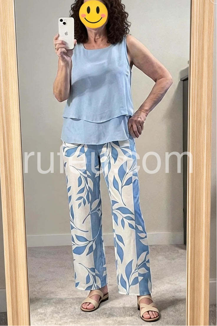 This two-piece set is my new summer staple. The layered top is very flattering and hides my tummy perfectly, while the pants have a comfortable elastic waist that doesn't dig in. The blue leaf pattern is even prettier in person. I just pair it with some sandals and a straw hat and I am good to go. True to size!