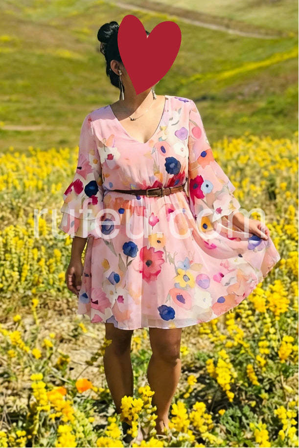 Embrace soft romance and effortless style in this Pink Watercolor Floral 3/4 Sleeve Mini Dress , a dreamy mini dress that captures the beauty of blooming spring. Crafted from lightweight, flowing fabric—likely chiffon or rayon blend—this dress features a delicate watercolor-inspired floral print in vibrant shades of pink, coral, navy, yellow, and white, creating a painterly effect across the soft blush base. The flattering V-neckline adds a touch of elegance, while the short ruffle sleeves bring playful volume and feminine charm. A relaxed, A-line silhouette ensures comfort and ease, making it perfect for casual days, brunches, or warm-weather outings. Paired here with layered bracelets and a pearl necklace, it exudes boho-chic appeal. Ideal for beach trips, garden parties, or weekend strolls, this dress brings a sense of lightness, joy, and timeless femininity to your wardrobe. Let this floral mini dress turn every moment into a gentle celebration of color and style.