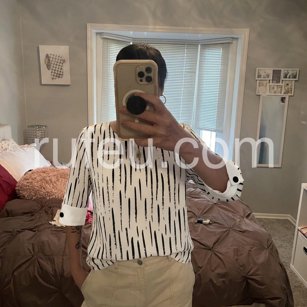 I bought this for work and absolutely love it! The abstract black and white pattern is so chic, and the 3/4 sleeves with the button detail add a perfect touch of elegance. It fits nicely and is very comfortable for a full day at the office.