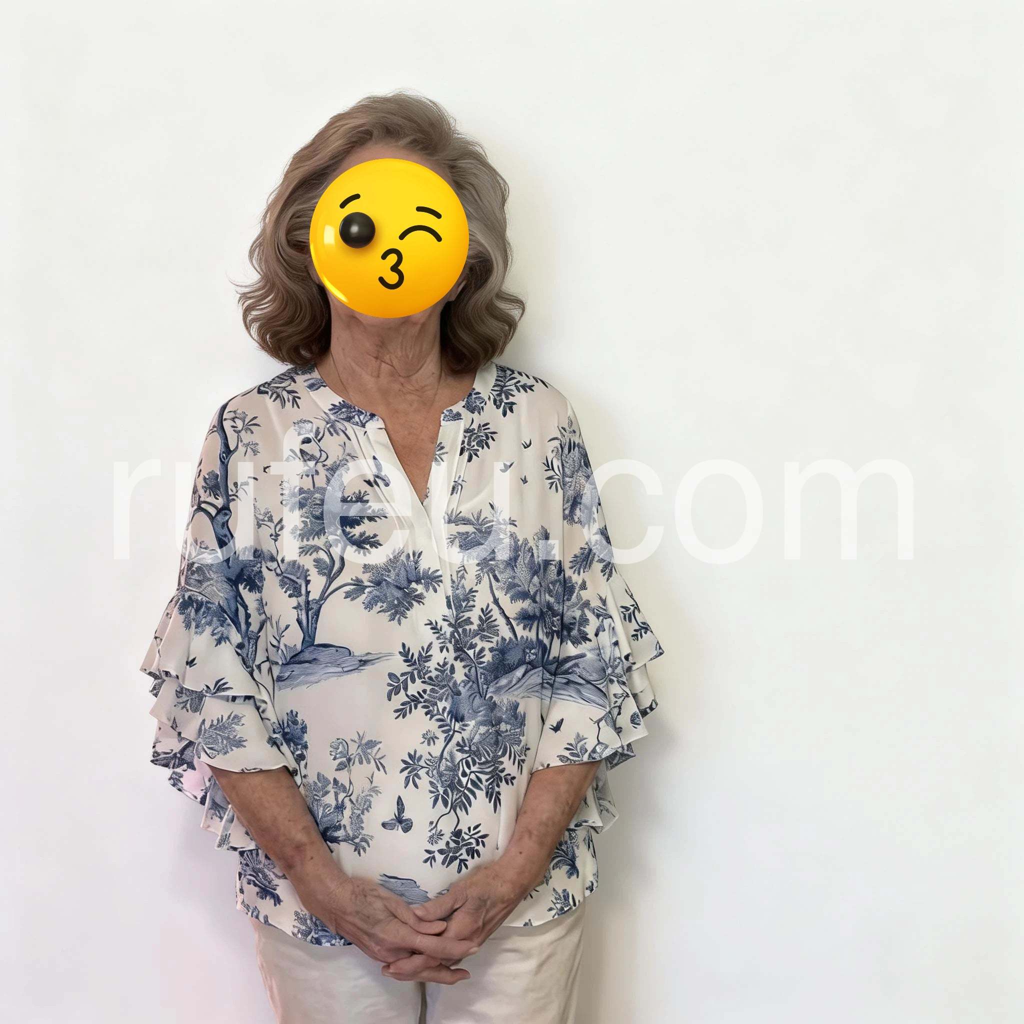 I'm impressed by how the blouse drapes; the ruffled sleeves bring a playful element while staying classy. It would pair nicely with white jeans or a tailored skirt.