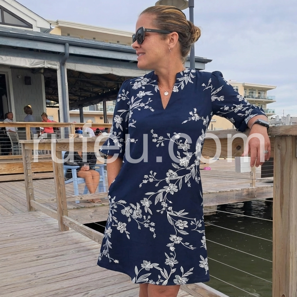 I absolutely love this dress! The fact that it has pockets is a huge win for me. The material is lightweight and perfect for my upcoming cruise. The navy blue and white floral pattern is so classic.