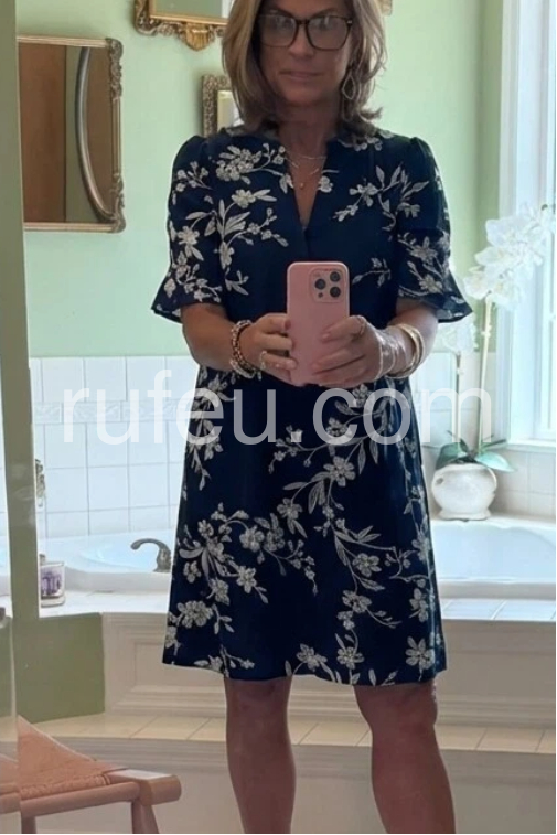 Enjoy effortless elegance with this navy floral dress. It features delicate white blooms and flared 3/4 sleeves, adding a romantic touch to the classic shift style.