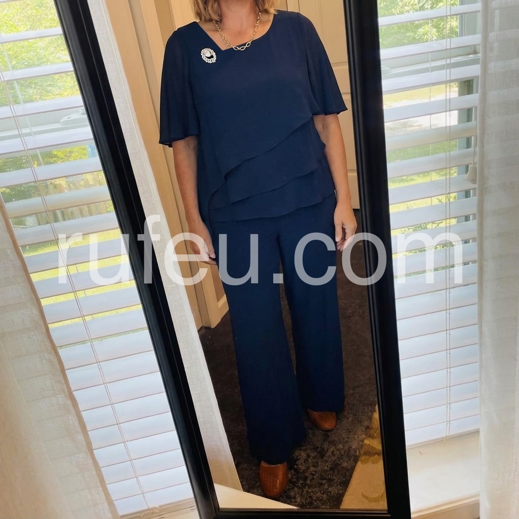 This outfit is a lifesaver. I am not a dress person, so finding something formal enough for an evening gala was stressing me out. This pant suit looks just as dressy as a gown. The navy color is deep and rich. It fits true to size and the chiffon overlay is gorgeous.