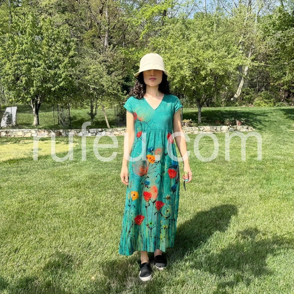 Beautiful dress and extremely comfortable. The fabric feels like a high-quality cotton linen blend that breathes well in warm weather. The v-neck is flattering without being too deep.