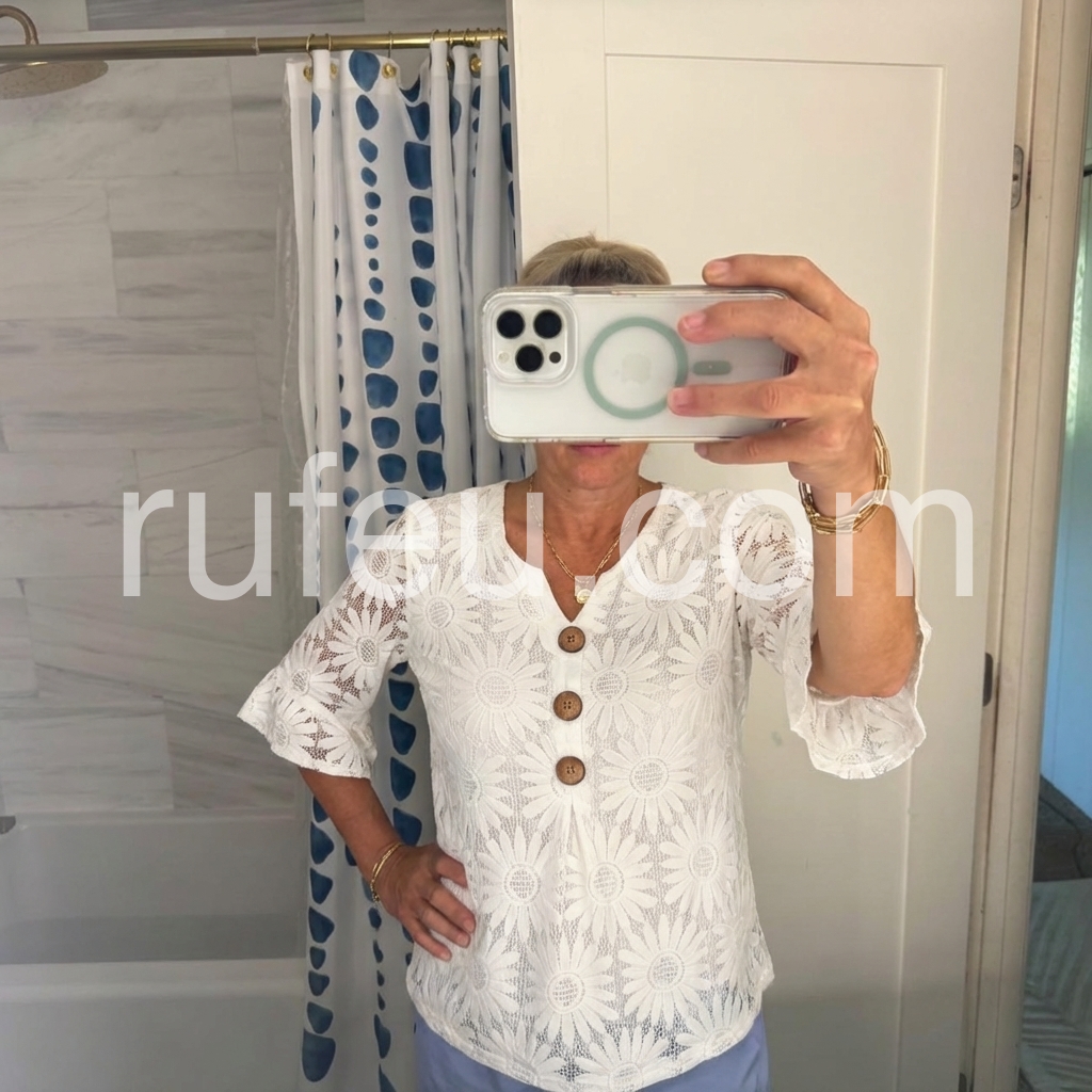I absolutely love this top! The daisy lace pattern is so cute and perfect for spring. It fits true to size and looks great with my favorite pair of jeans. Highly recommend!