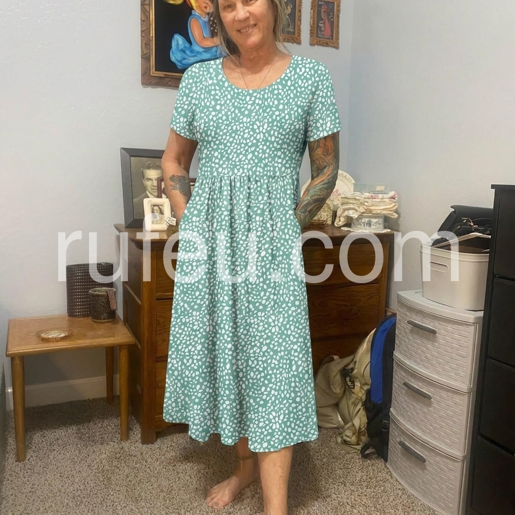 The round neck, flowy A-line fit, and pockets create a comfortable, flattering silhouette, perfect for everyday wear and casual outings.
