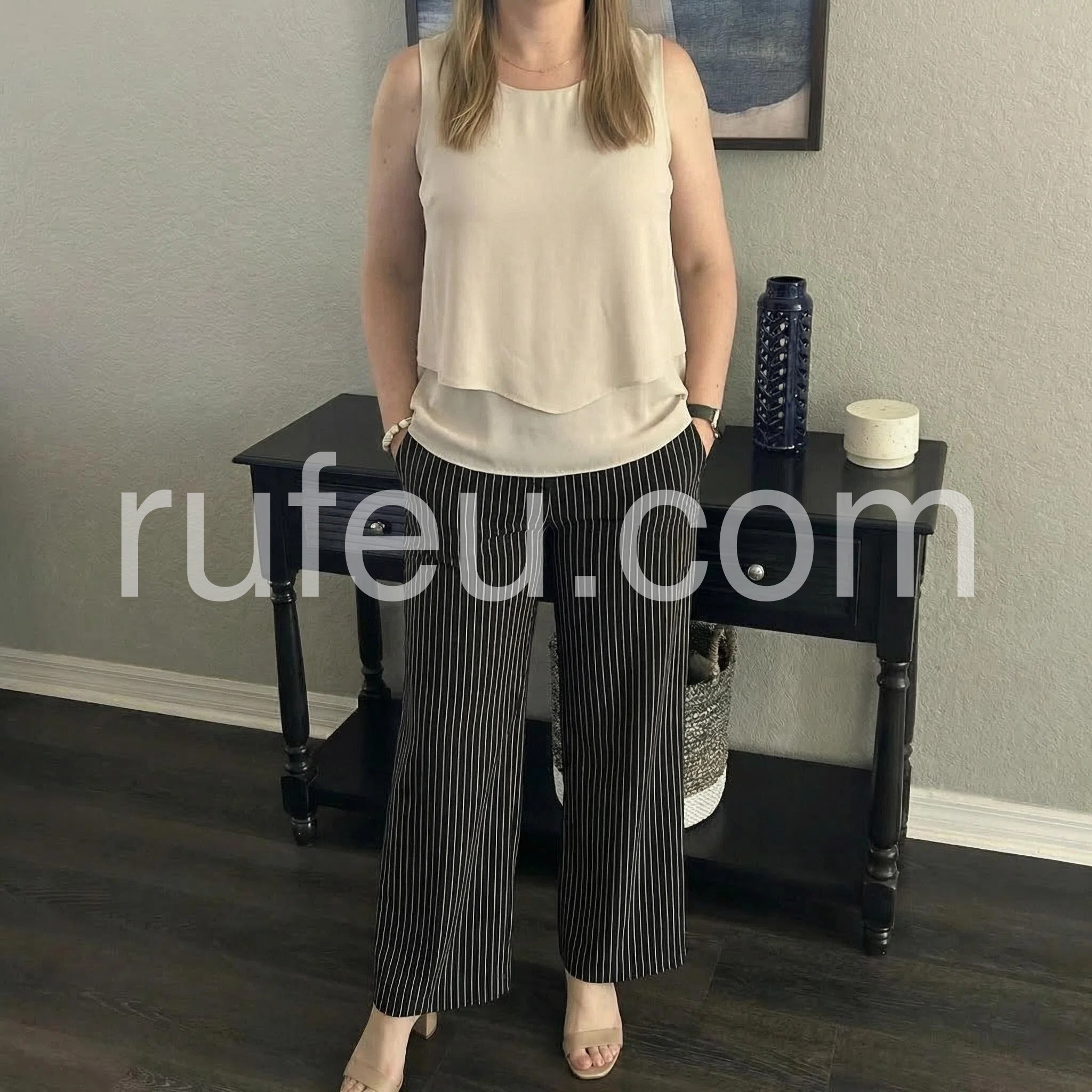 This two-piece set features a sleeveless beige top with a layered hem and square neckline. Paired with high-waisted black wide-leg pants in thin white stripes. Comfortable fit with a chic, relaxed silhouette. Perfect for casual outings or smart-casual events. Effortlessly stylish and easy to wear.