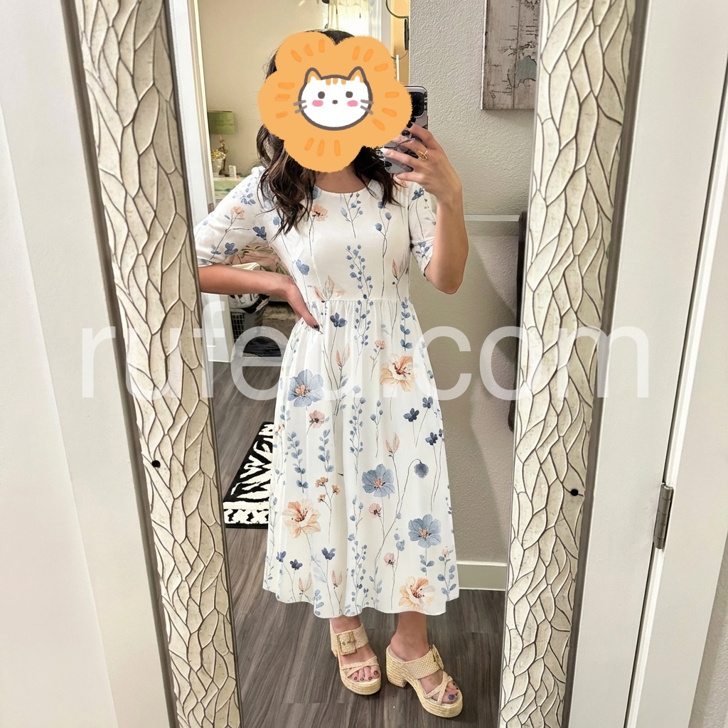 This is the perfect summer dress. The floral print is delicate and exactly as pictured. I appreciate the modest half sleeves and the midi length, which make it great for church or a casual brunch. Fits true to size.
