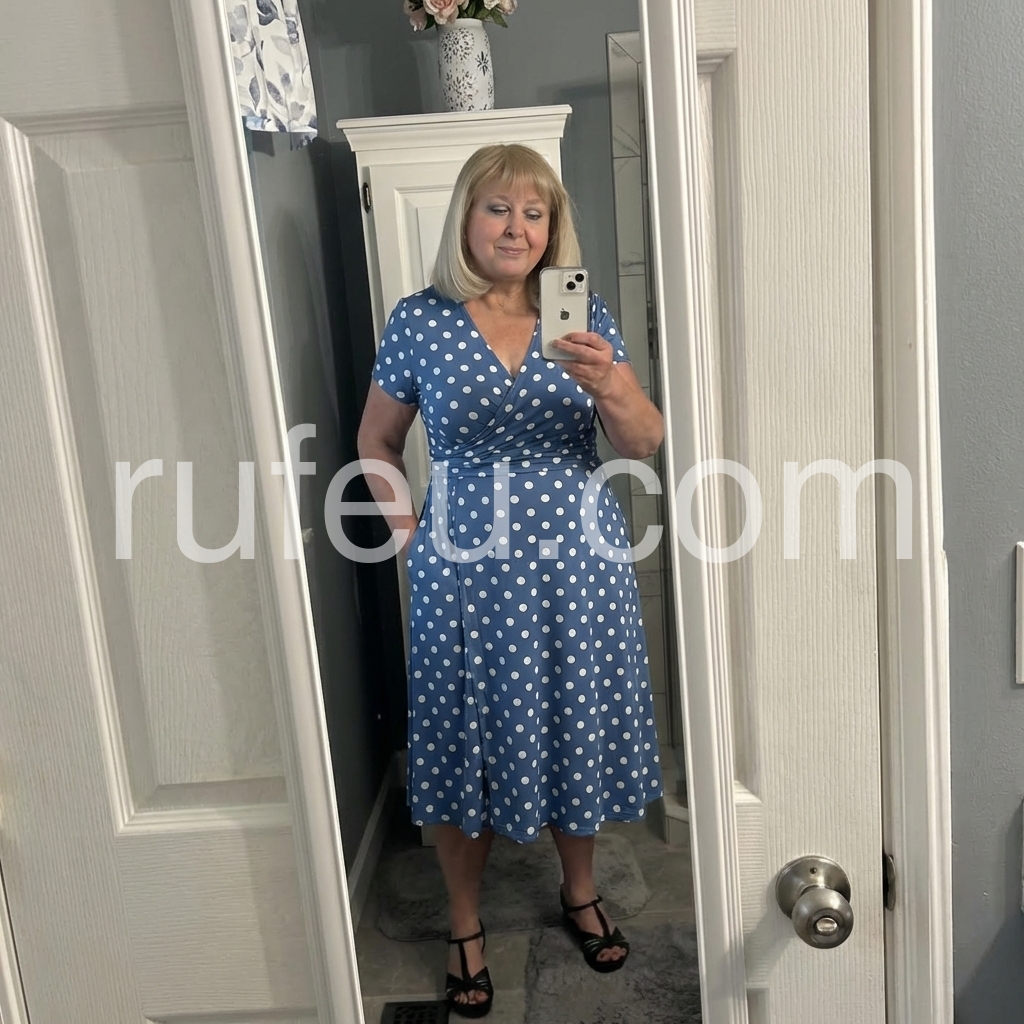 This blue polka dot dress is exactly what I was looking for! The v-neck is flattering and the waist cinches perfectly. Wore it on my beach vacation and got so many compliments.