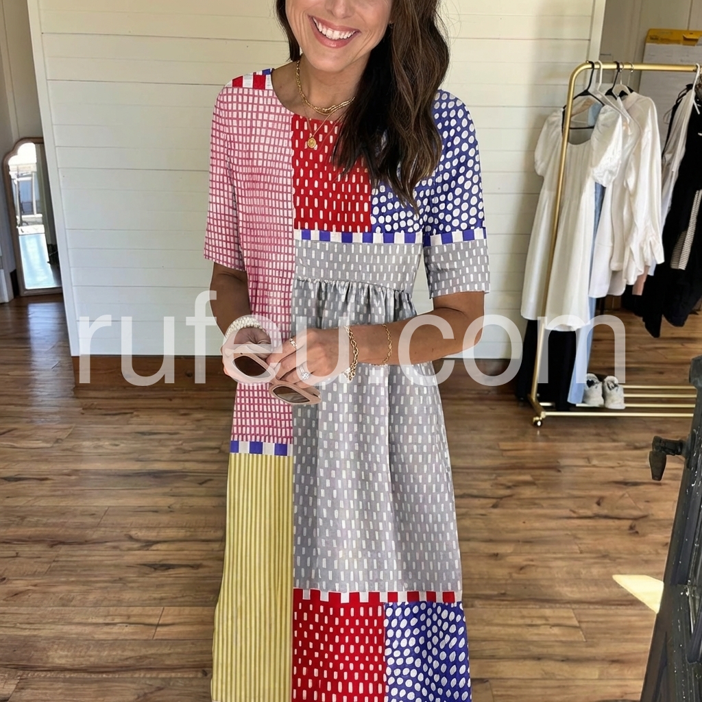 The bold, multicolored geometric patchwork print makes a striking statement, while the gathered waist and pockets add comfort and function.