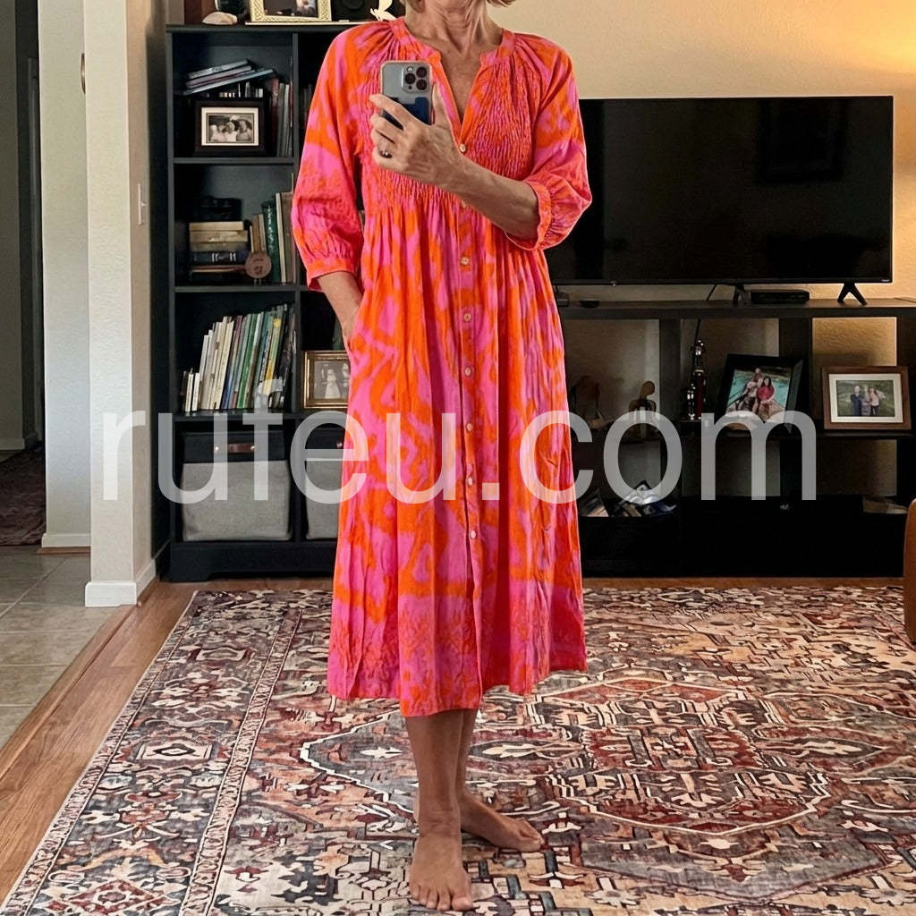 This super-glam hot pink and orange print midi dress is all you need to make a style impression, featuring a round v-neck collar, buttons down the front, and a shirred flattering top. Three-quarter length sleeves provide coverage and versatility to this everyday sophisticated blouse dress. Machine wash cold tumble dry low to medium heat. Iron if needed or lay flat to dry.
