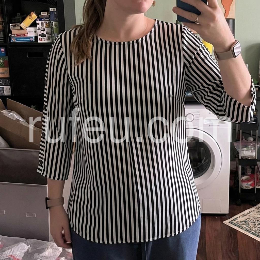 This vertical striped top features a relaxed fit with a round neckline. Three-quarter sleeves with button details and rolled cuffs. Lightweight fabric perfect for everyday wear. Ideal for pairing with jeans or trousers. Timeless and stylish design.