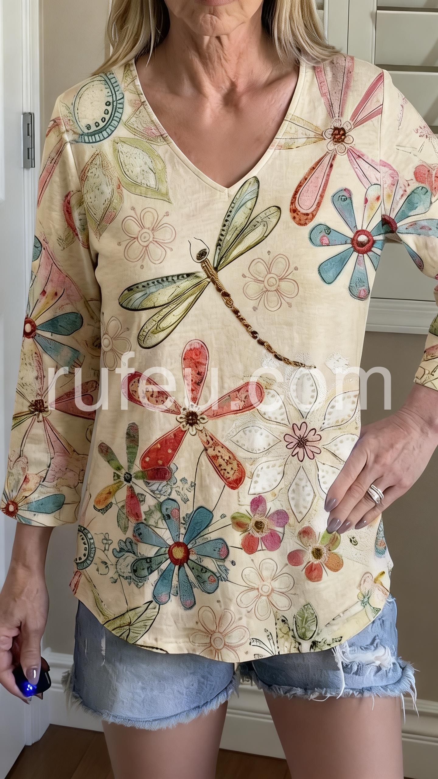 This loose-fitting top features a charming floral and dragonfly print on a soft cream base. With a deep V-neck. Perfect for casual days or bohemian style. Pair with white pants for a fresh, airy vibe. Light, artistic, and full of nature-inspired charm.