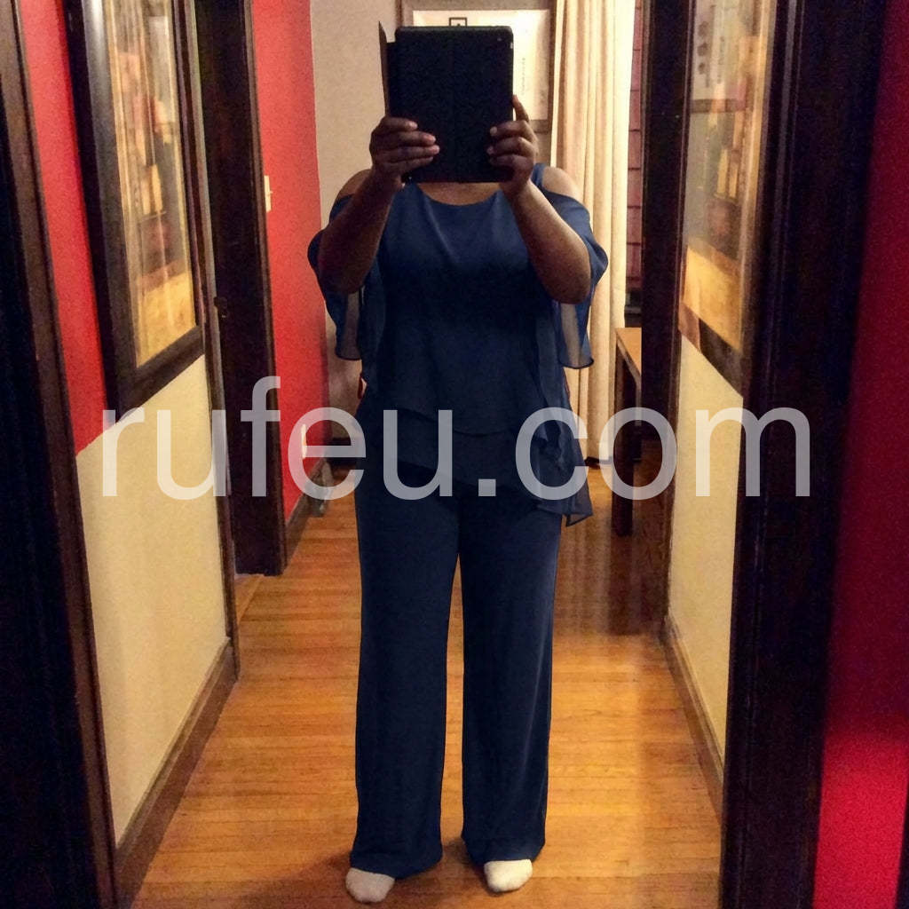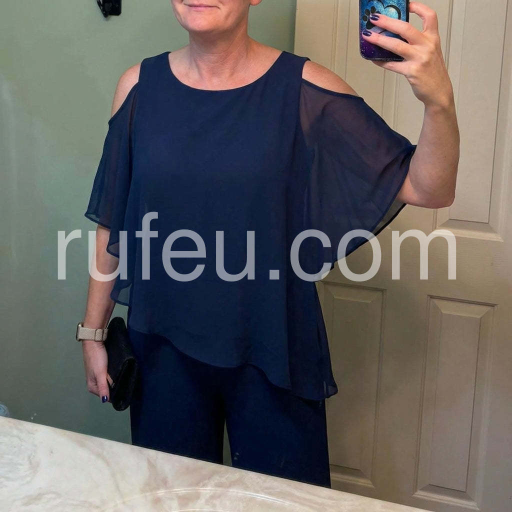This fashionable two-piece set includes a navy cold shoulder three-quarter length draped sleeves and asymmetrically layered ruffled top and pants. Crafted from lightweight and soft materials, this set is perfect for any occasion. Step up your look with this stylish set.