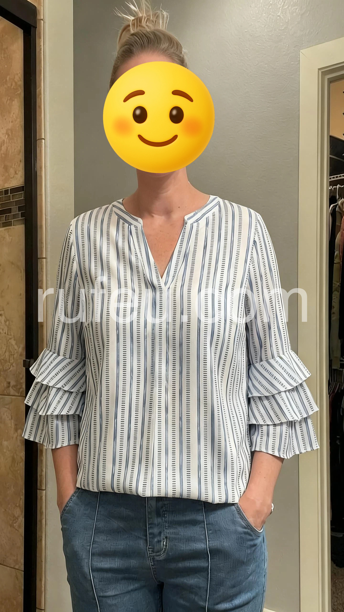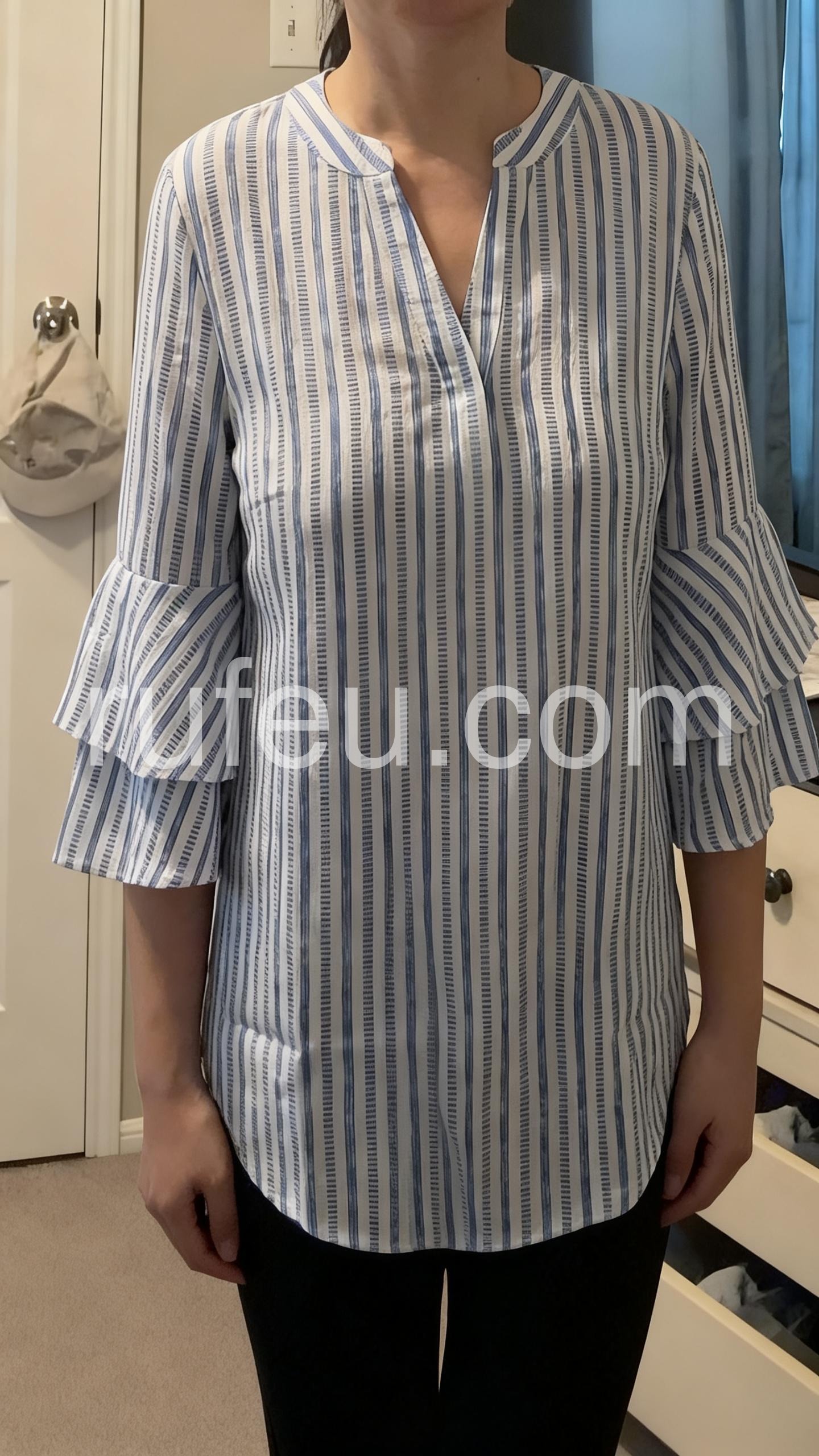 As a curvy woman I was worried the ruffles might add bulk but the vertical stripes and V-neck make it very flattering. It skims over the tummy area really nicely.