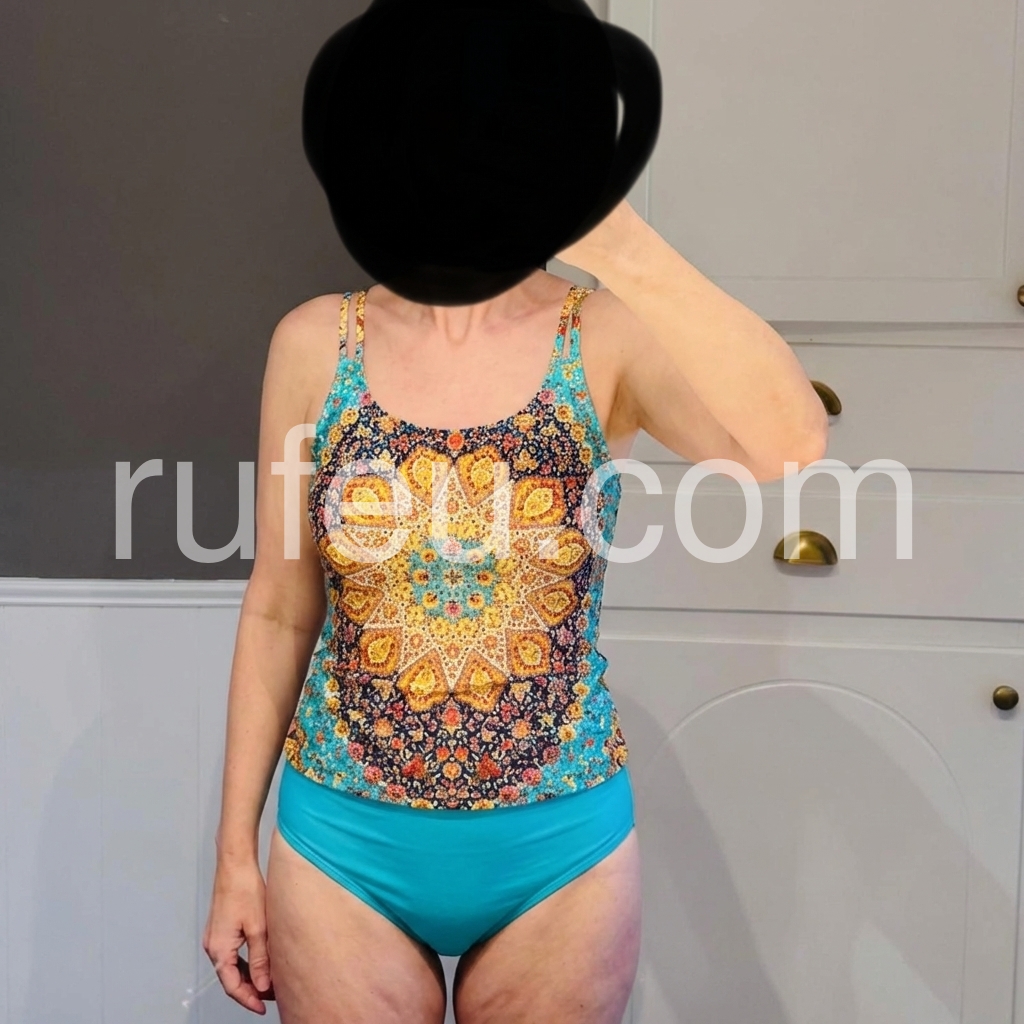 I love the colors on this swimsuit! I purchased to wear to a water park with my kids. The coverage is great. The top fit me well. I’m not overly endowed by have broad shoulders so I ordered a large based on the measurements. It was true to the measurements given. I’m very pleased with the swim suit.