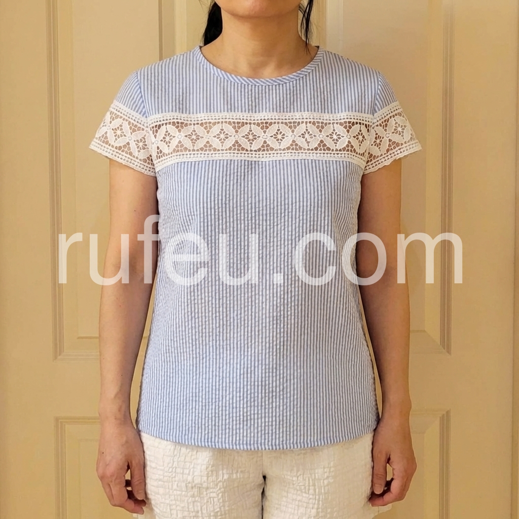 This short-sleeve top features a delicate white lace panel across the chest and sleeves. Made from soft, textured fabric with vertical stripes for a subtle pattern. Perfect for casual summer days or beach outings. Pair with shorts or jeans for a stylish look. Effortlessly chic and breathable.