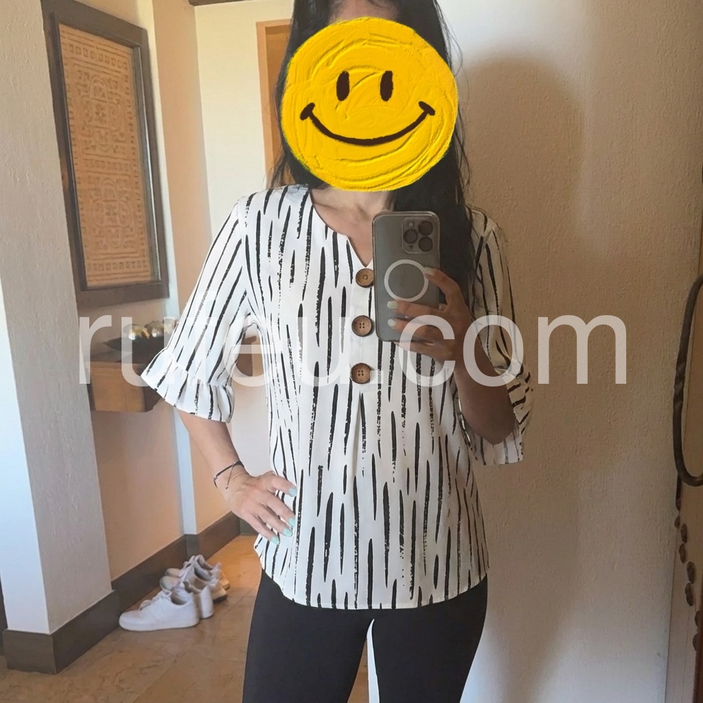 This loose-fitting top features a bold black abstract stripe print on white. V-neckline with wooden buttons down the front. Three-quarter sleeves with ruffled cuffs for a feminine touch. Lightweight and breathable, perfect for casual wear. Easy to pair with jeans or pants.