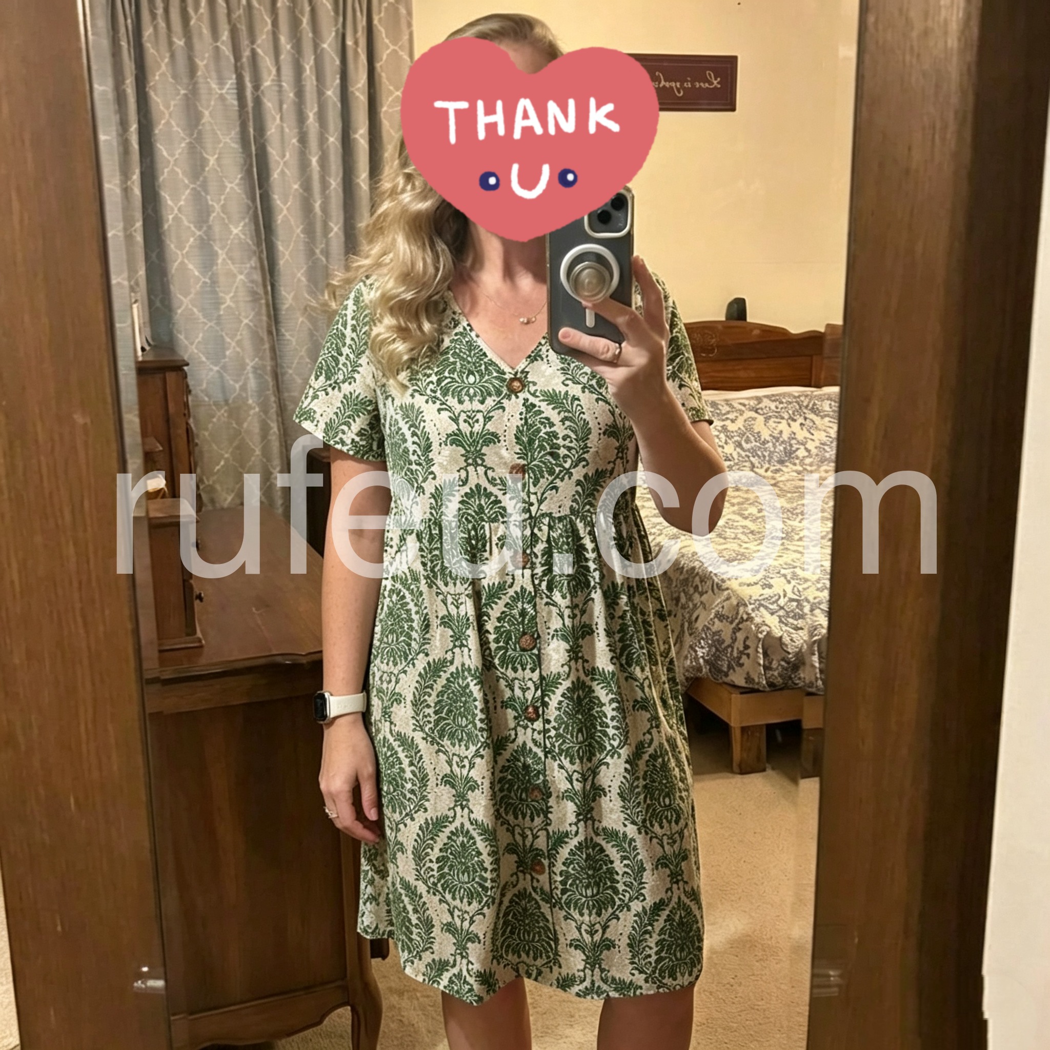 This dress brings vintage-inspired charm to everyday wear. The rich green damask print feels unique and elegant, while the relaxed A-line silhouette skims over curves. The loose fit avoids clinging to midsection areas, making it ideal for casual wear.