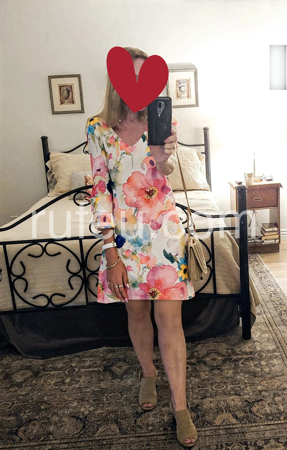 As a mature woman, it is hard to find dresses that are fun but still offer coverage. This dress is gorgeous, giving great arm coverage with those cute ruffled sleeves.