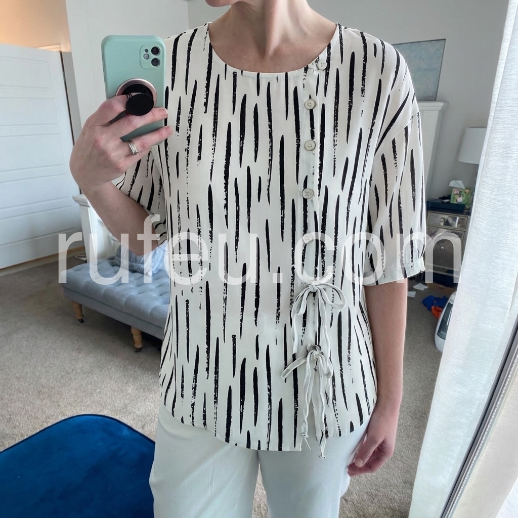 This relaxed-fit blouse features a bold black abstract stripe print on a white base. Round neckline with front button closure and side tie details. Lightweight fabric perfect for everyday wear. Ideal for pairing with jeans or leggings.