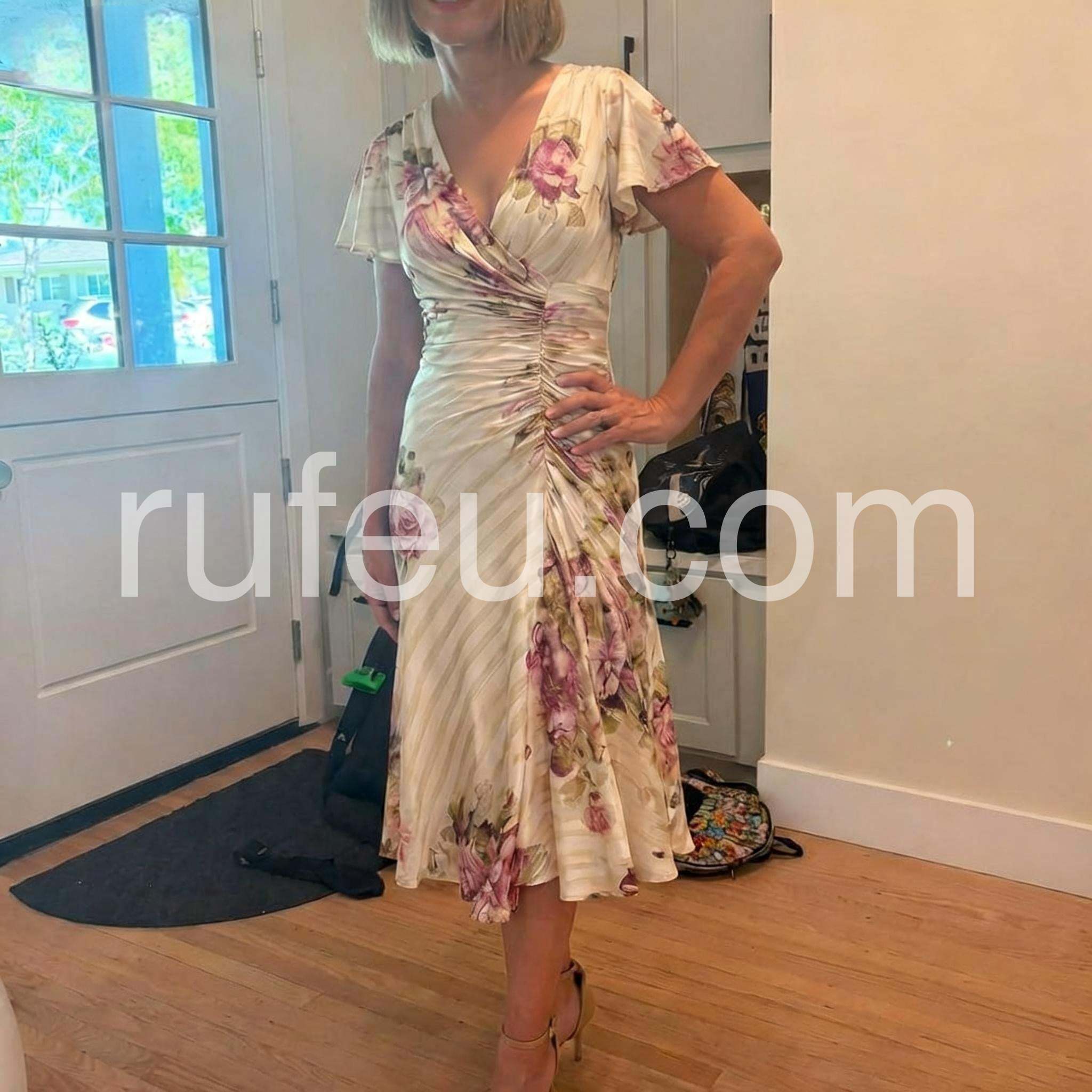 This exquisite cream satin midi dress exudes timeless elegance with its soft floral print of blush pink roses and delicate greenery, set against a subtle striped background. The wrap-style design features a deep V-neckline and a ruched waist that accentuates the figure, creating a flattering silhouette. Flutter sleeves add a romantic touch, while the flowing A-line skirt moves gracefully with every step. Crafted from luxurious satin fabric, it has a smooth, lustrous finish perfect for special occasions or sophisticated evening wear. Paired with strappy heels, layered necklaces, and a small clutch, this dress captures vintage charm with modern refinement. Ideal for garden parties, bridal showers, or elegant dinners, it’s a statement piece that blends femininity, grace, and classic beauty—making it a must-have for any fashion-forward wardrobe.