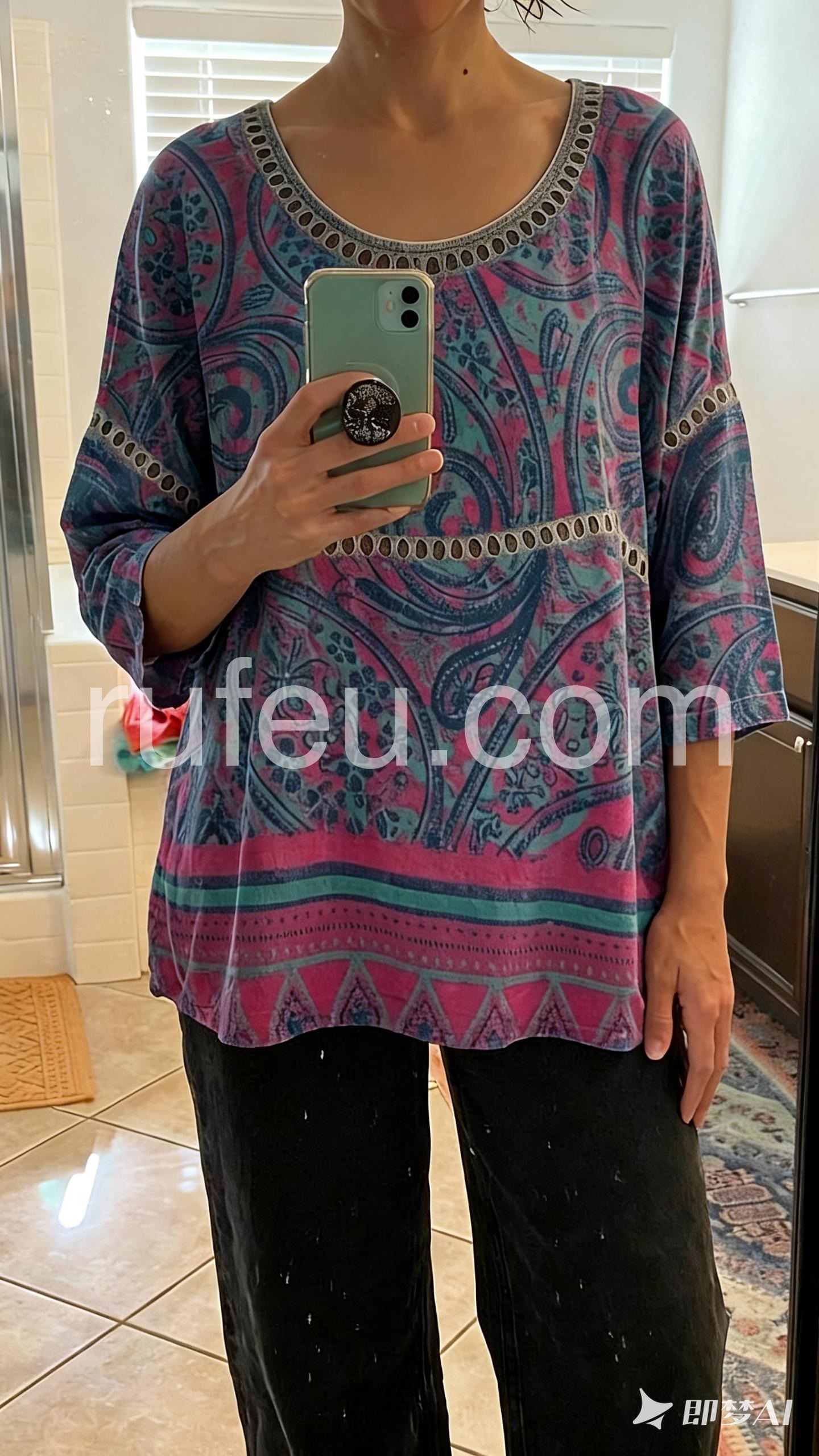 Embrace free-spirited fashion with this Special Paisley Print Round Neck Top, a bold and artistic statement piece that brings vibrant energy to any outfit. Crafted from soft, lightweight fabric—likely cotton or rayon blend—this relaxed-fit tunic features an eye-catching paisley pattern in rich shades of deep purple, teal, and fuchsia, accented with intricate tribal-inspired motifs. The design is elevated by delicate black circular trim along the neckline, sleeves, and waistband, adding a touch of bohemian flair and contrast. With its three-quarter sleeves and slightly asymmetrical hem, this top drapes beautifully over jeans, leggings, or skirts, making it perfect for casual outings, music festivals, or weekend adventures. Layer it with layered necklaces, bracelets, and sandals for a full-on boho look—just like in this Lulus-inspired ensemble. Ideal for those who love expressive prints and effortless style, this tunic combines comfort, color, and cultural artistry into one wearable masterpiece. A must-have for anyone craving a touch of wanderlust in their wardrobe.
