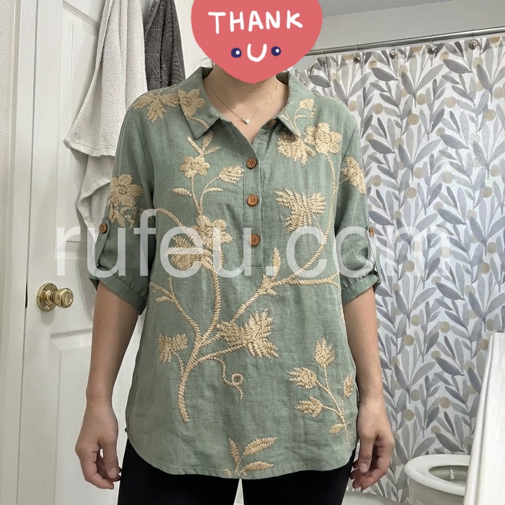 I absolutely love this blouse! The floral embroidery is gorgeous and adds such a nice texture to the top. The sage green color is exactly as pictured. It fits true to size and the linen-like material is perfect for warm weather. Highly recommend!